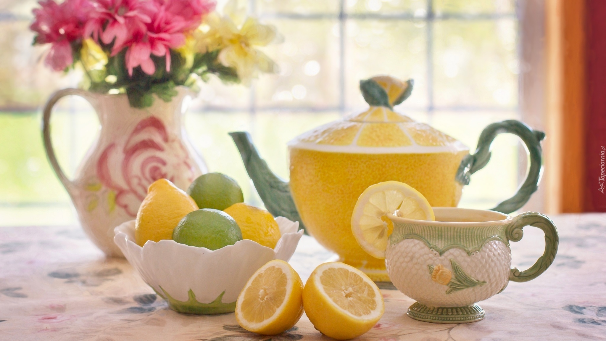 Edytor tapety: Kompozycja, Imbryk, Filiżanka, Herbata, Limonki, Cytryny