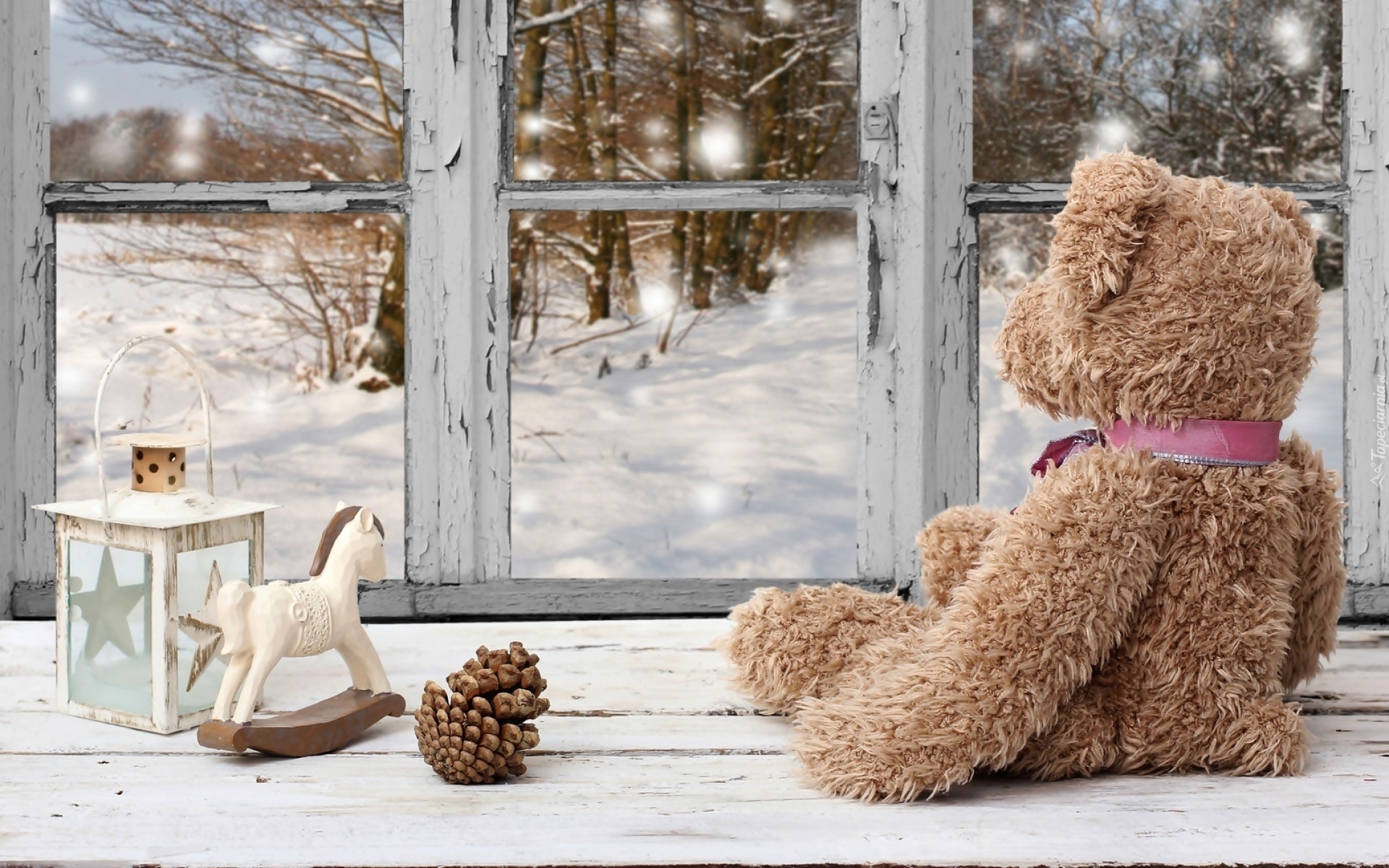 Edytor tapety: Miś, Zabawka, Lampion, Okno, Droga, Drzewa, Zima, Dekoracja