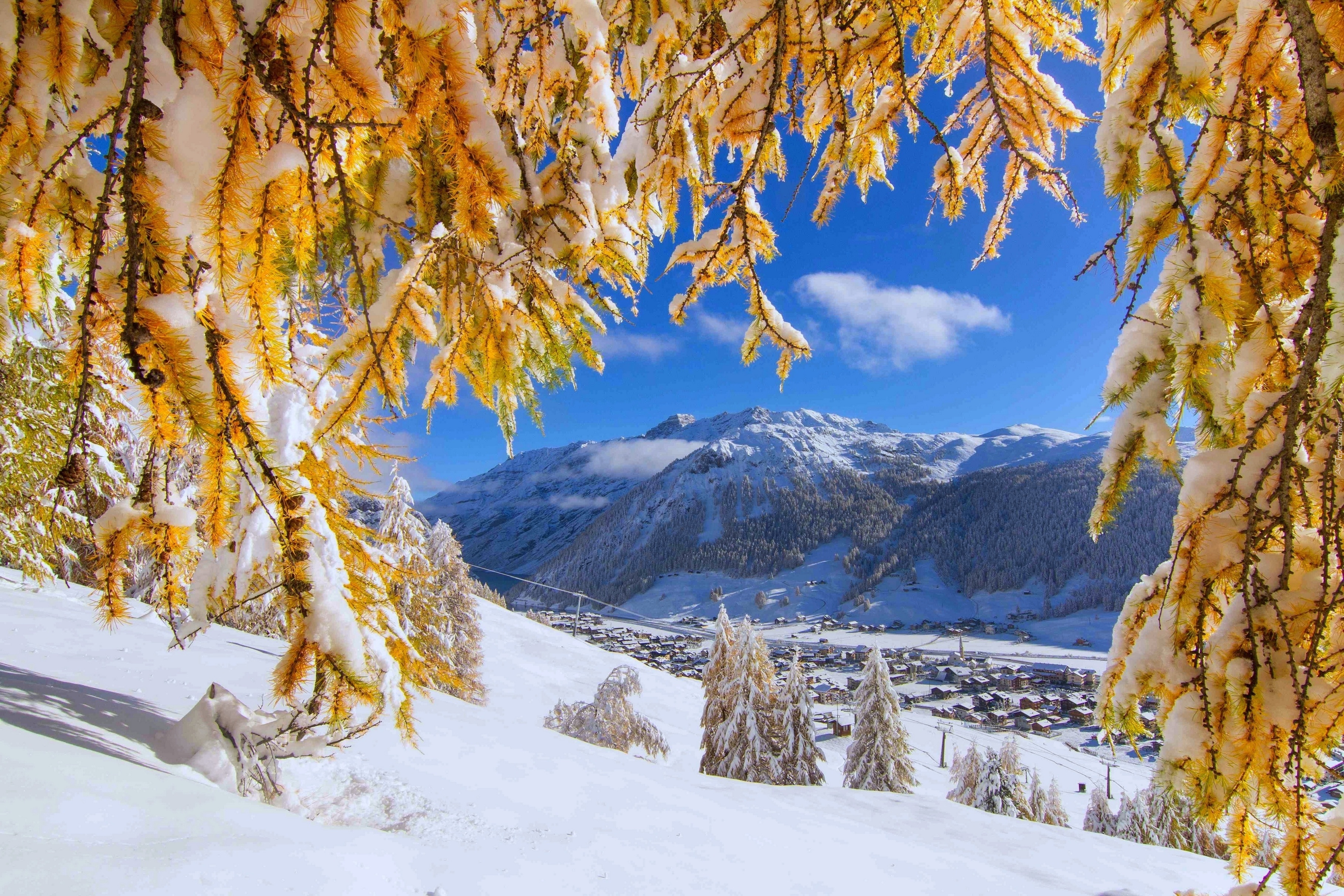Edytor tapety: Góry, Drzewa, Domy, Śnieg