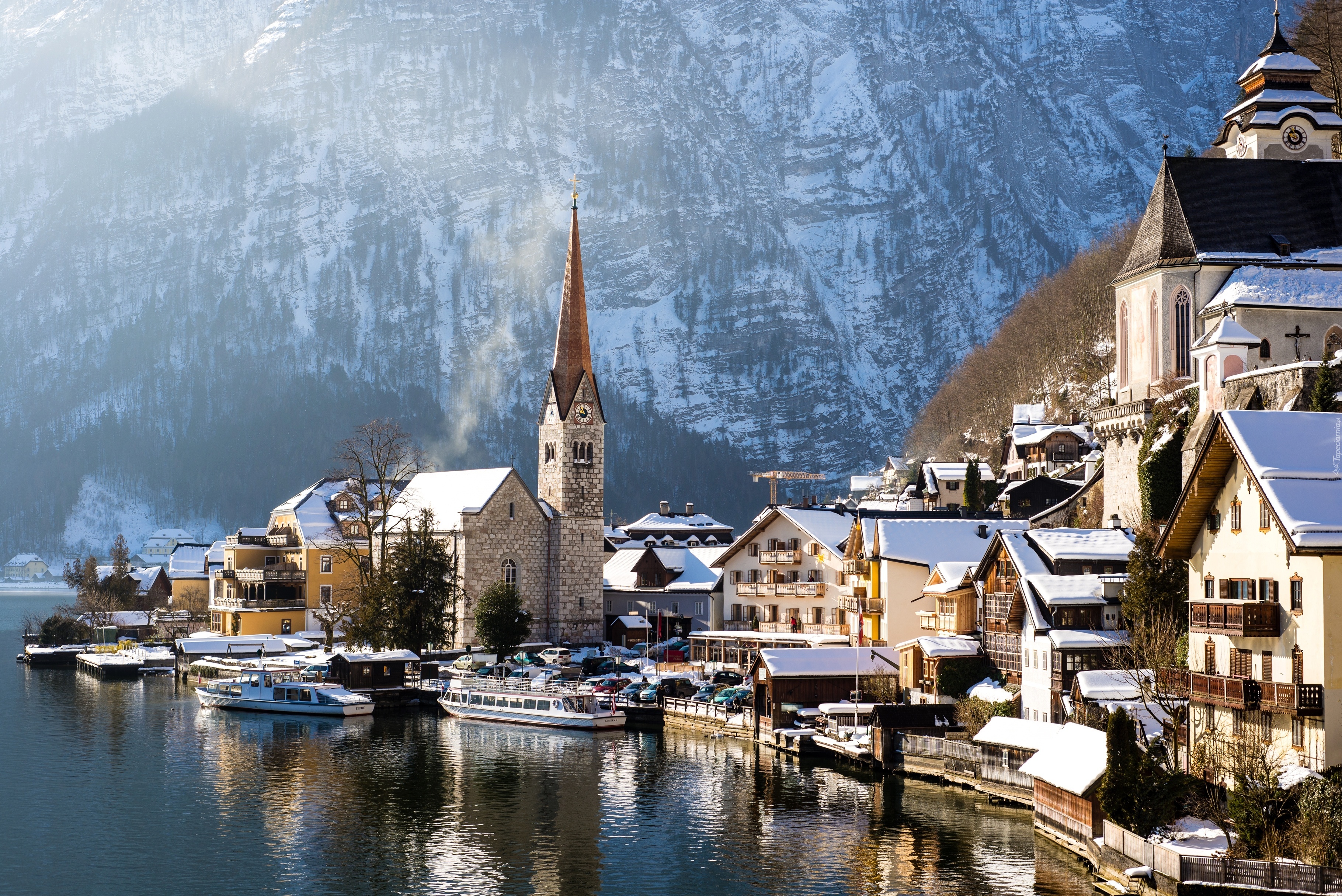 Edytor tapety: Góra, Jezioro, Domy, Kościół, Statki