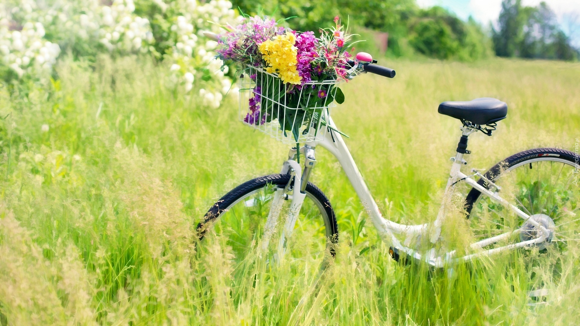 Edytor tapety: Łąka, Trawa, Rower, Kwiaty
