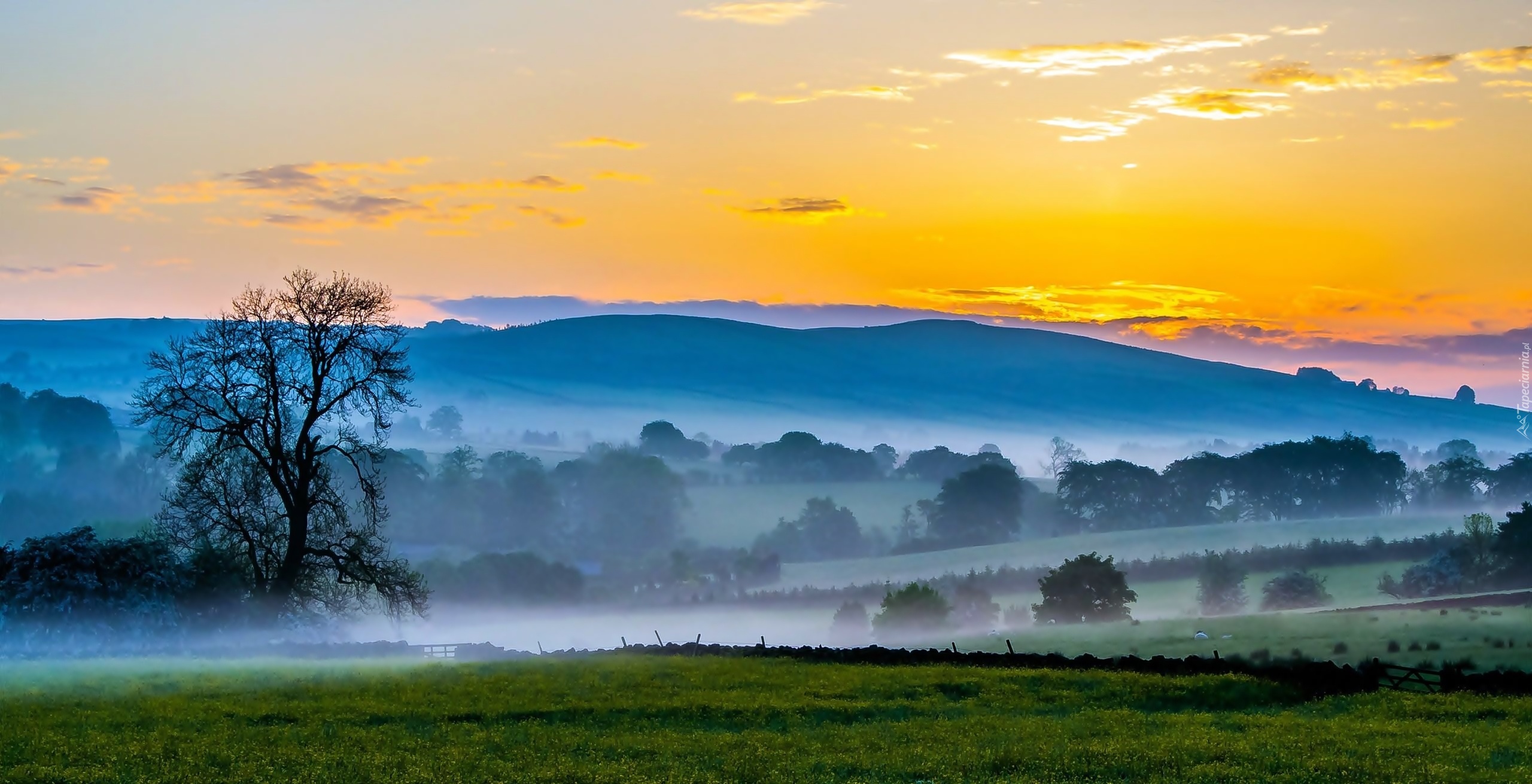 Edytor tapety: Łąki, Pola, Drzewa, Góry, Wzgórza, Mgła, Wschód, Słońca