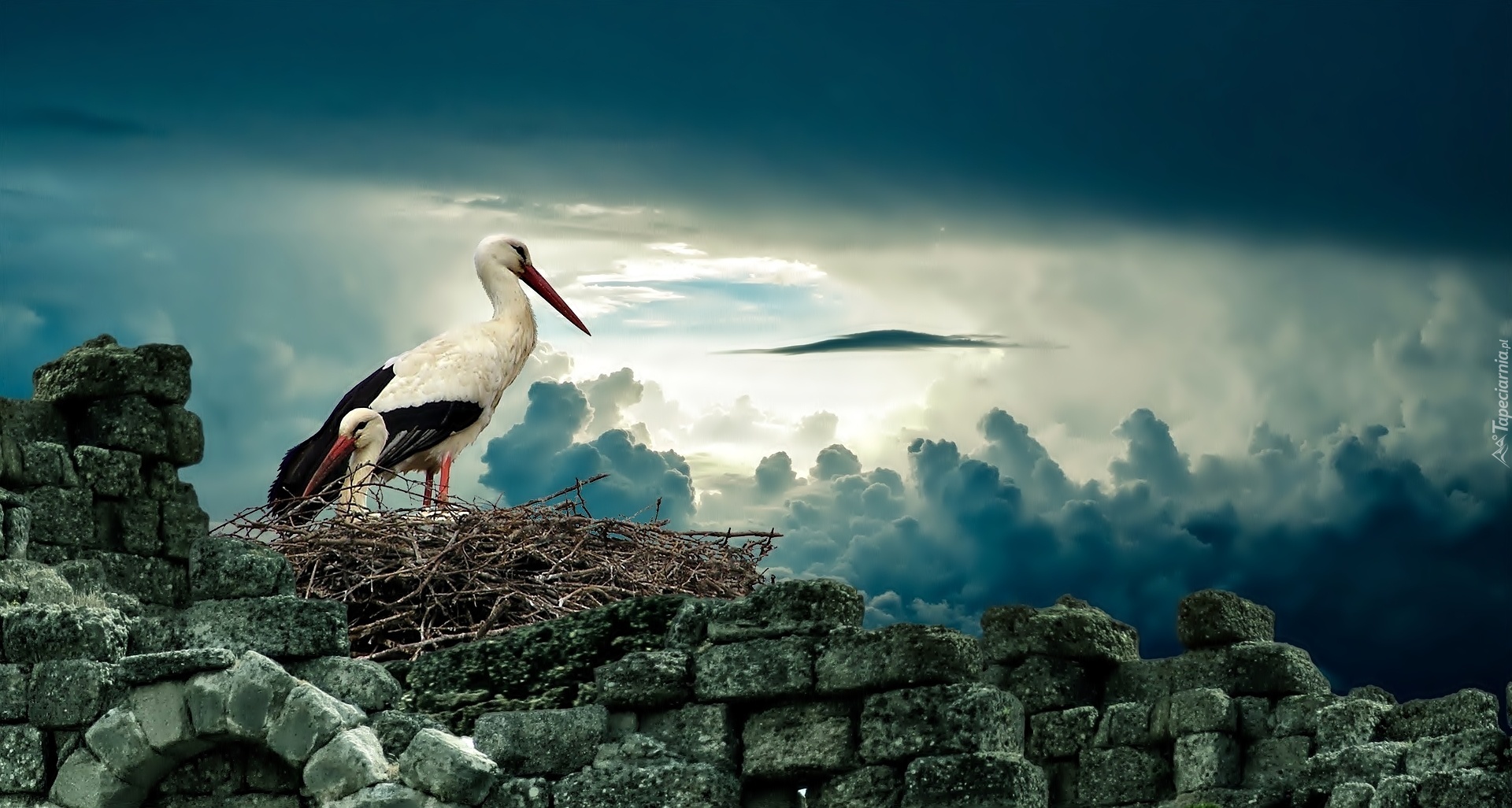 Edytor tapety: Bociany, Gniazdo, Mur, Chmury