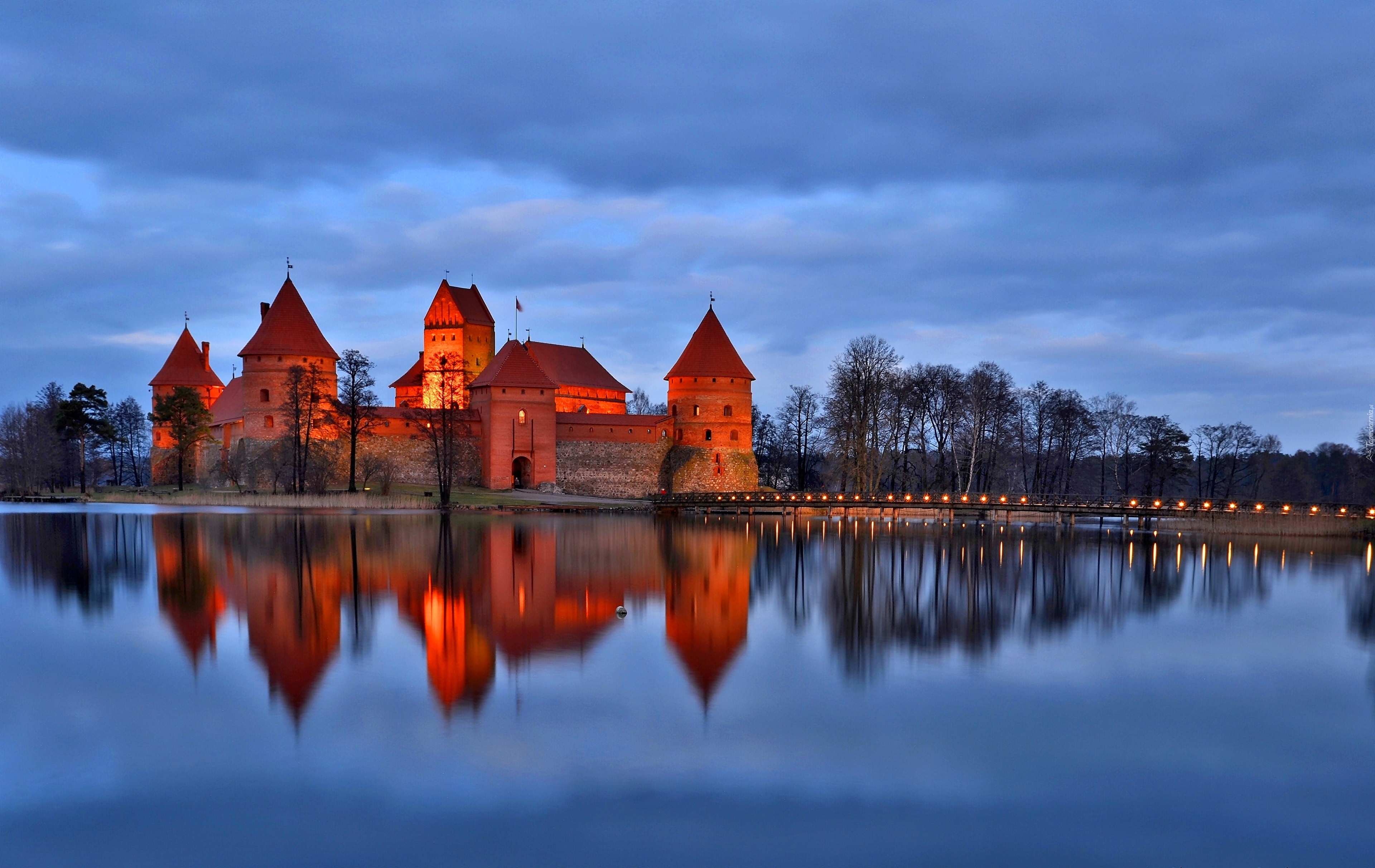 Edytor tapety: Zamek w Trokach, Troki, Litwa, Jezioro Galwe, Most, Zmierzch