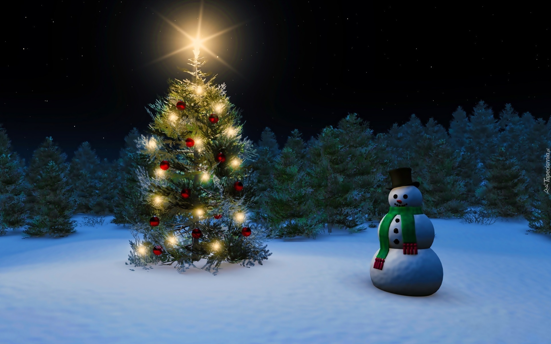 Edytor tapety: Świąteczna, Choinka, Bałwanek, Świerki, Zima
