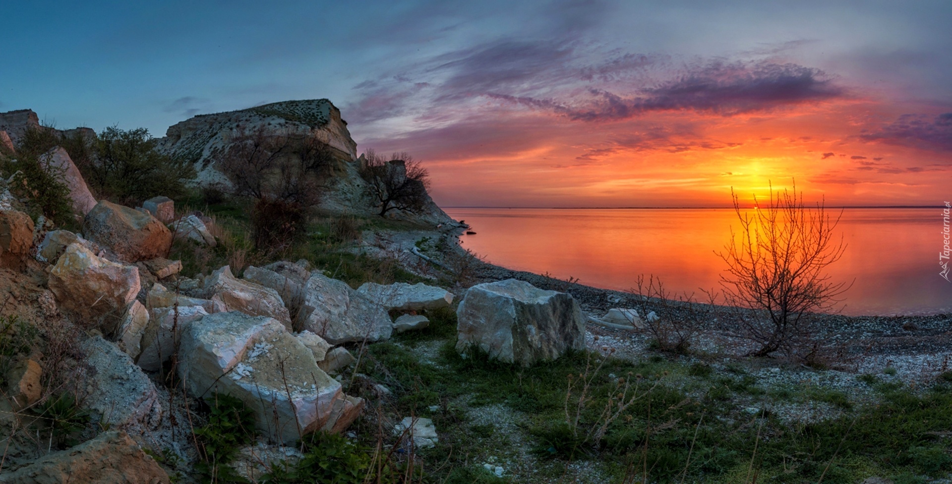 Edytor tapety: Kamienie, Zachód, Słońca, Jezioro