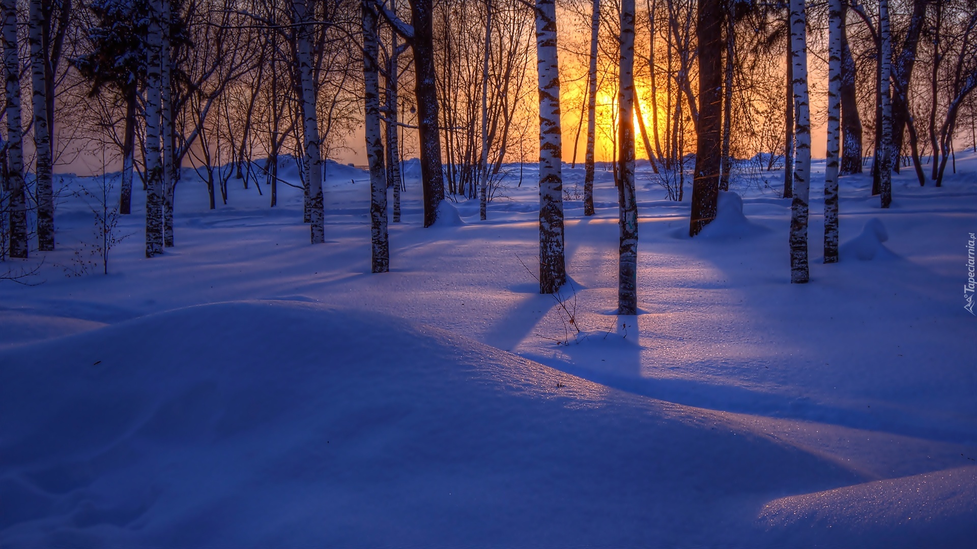 Edytor tapety: Las, Drzewa, Brzozy, Zaspy, Wschód, Słońca, Zima