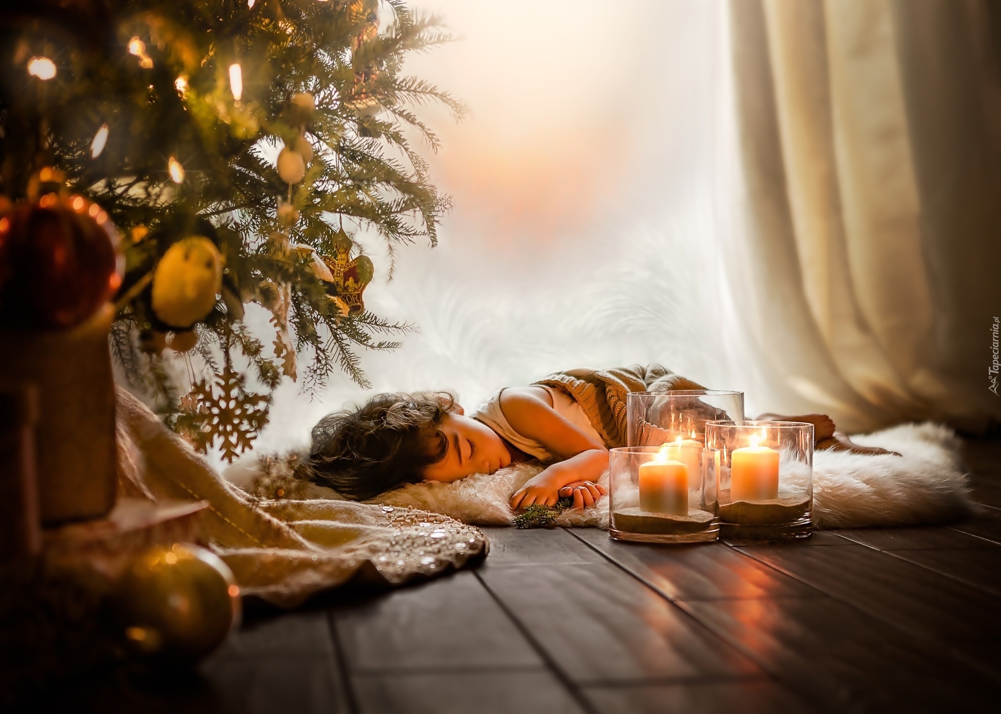 Edytor tapety: Śpiący, Chłopiec, Choinka, Bombki, Świece, Świąteczne