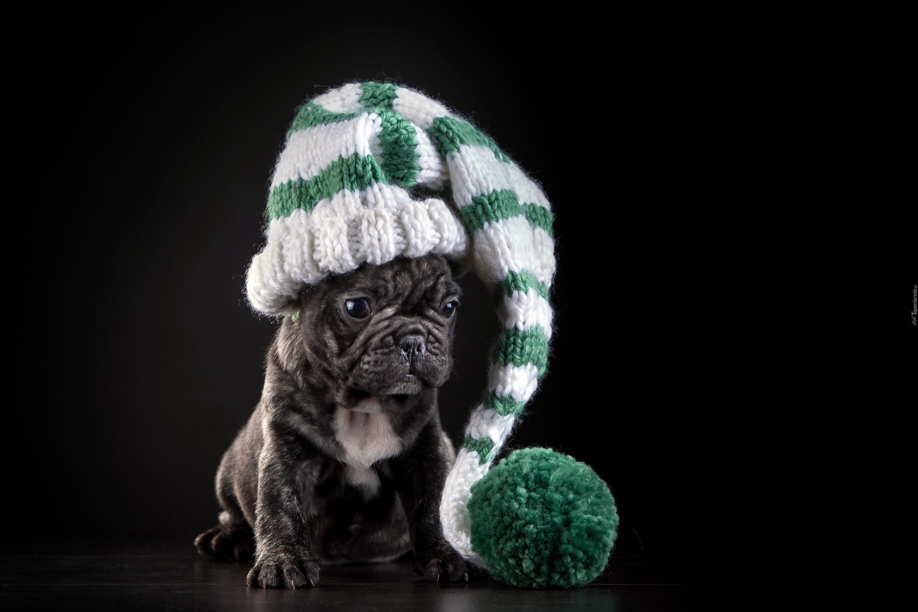 Edytor tapety: Pies, Buldog francuski, Szczeniak, Zimowa, Czapka, Pompon, Dzianina