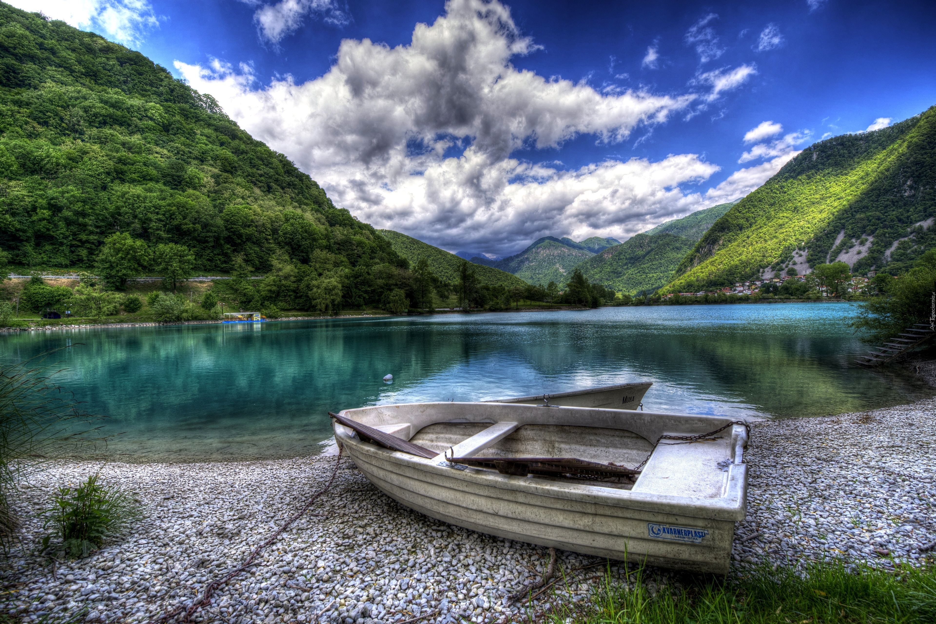 Edytor tapety: Słowenia ,Góry, Jezioro, Drzewa, Brzeg, Łódka