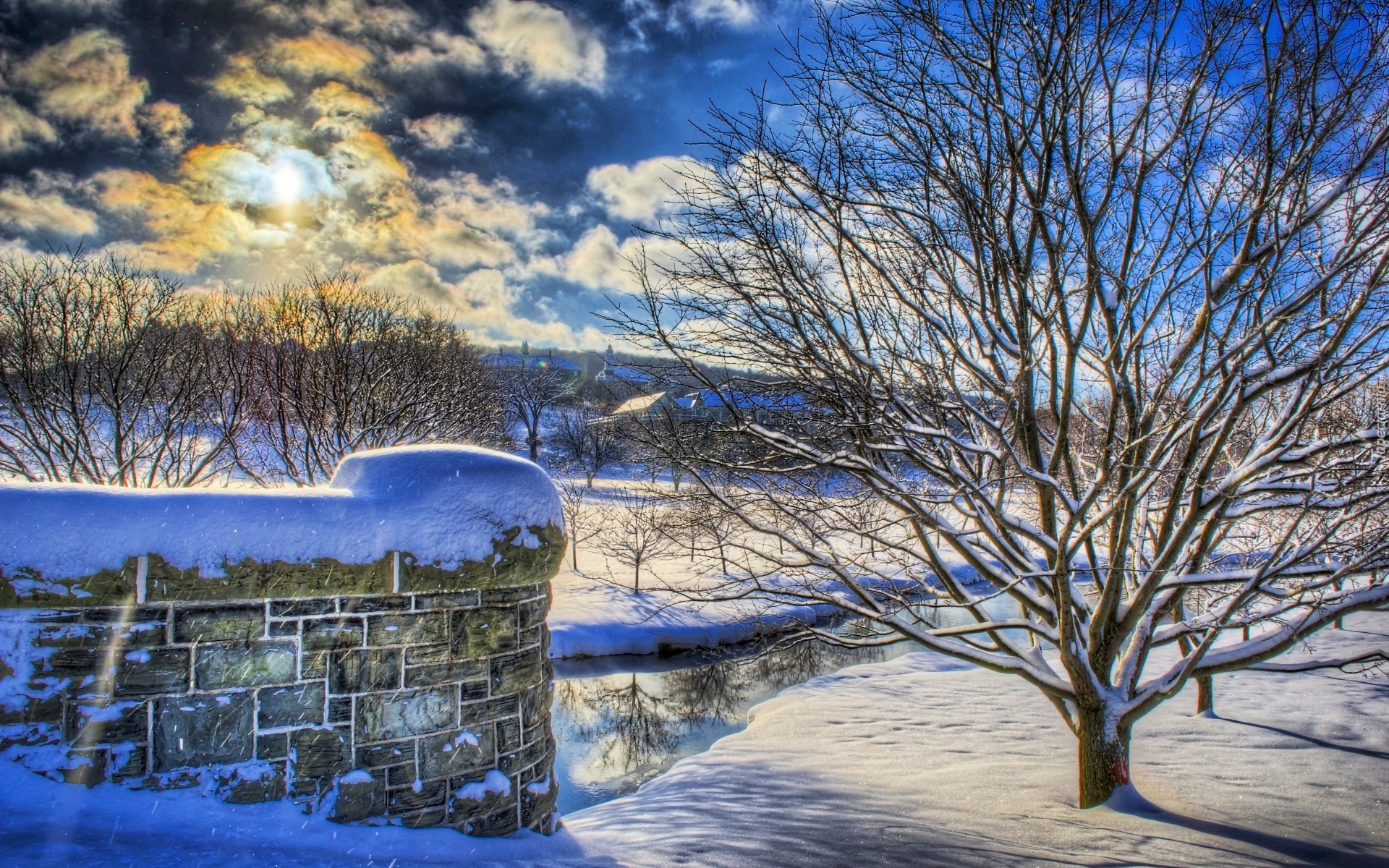 Edytor tapety: Zima, Śnieg, Mur, Rzeczka, Drzewa