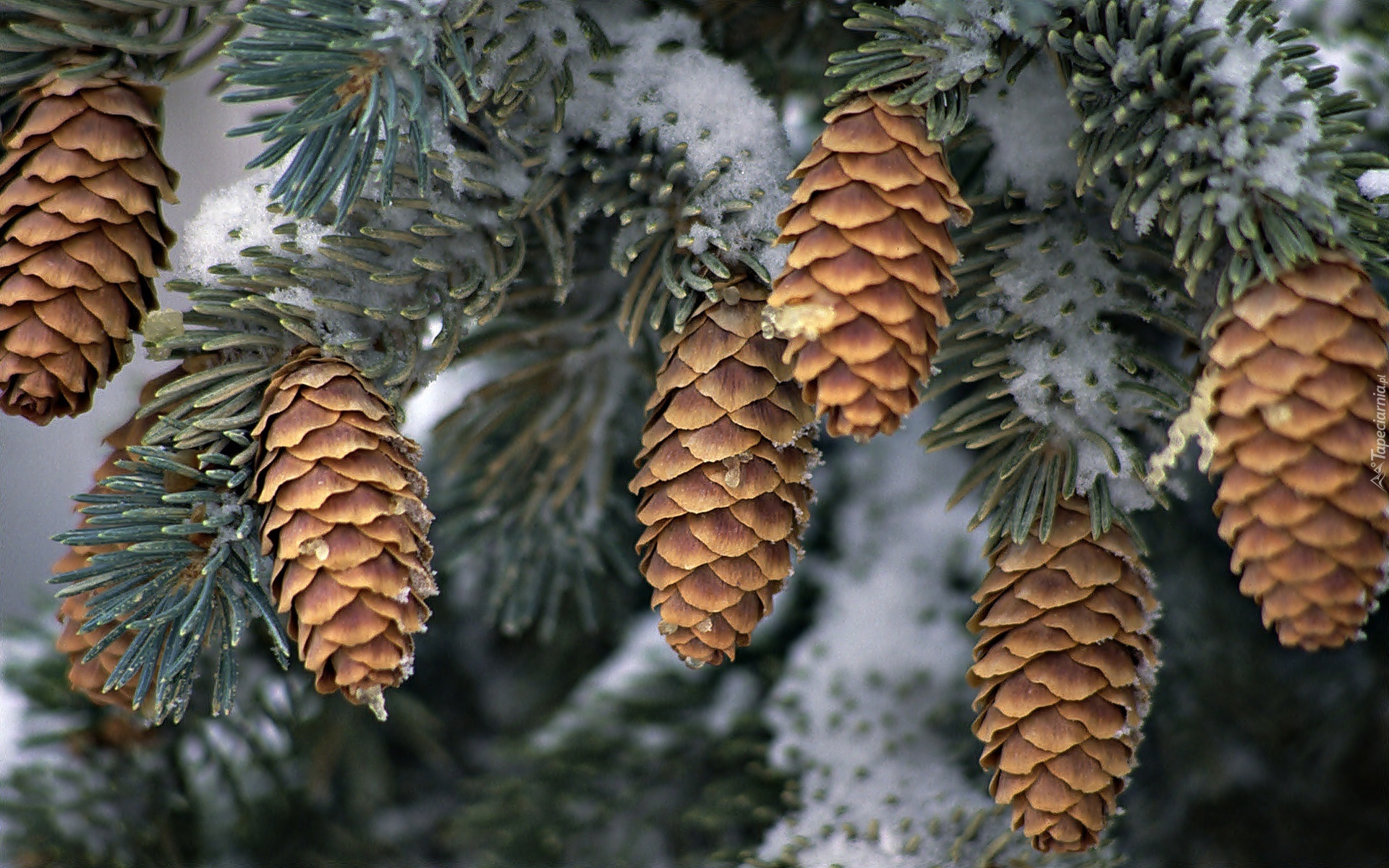 Edytor tapety: Świerk, Gałązki, Szyszki, Śnieg