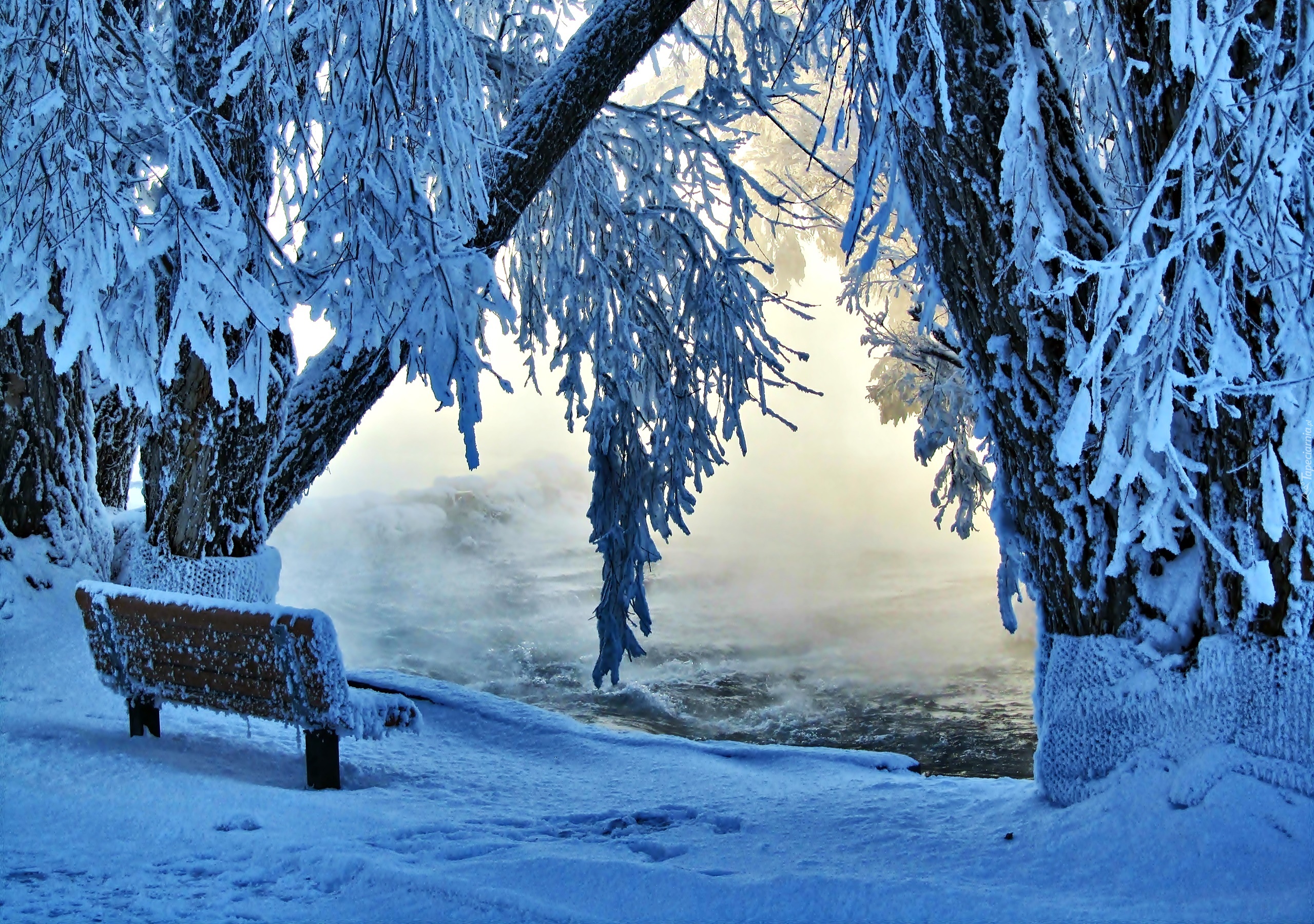 Edytor tapety: Zima, Ławka, Rzeka, Drzewa