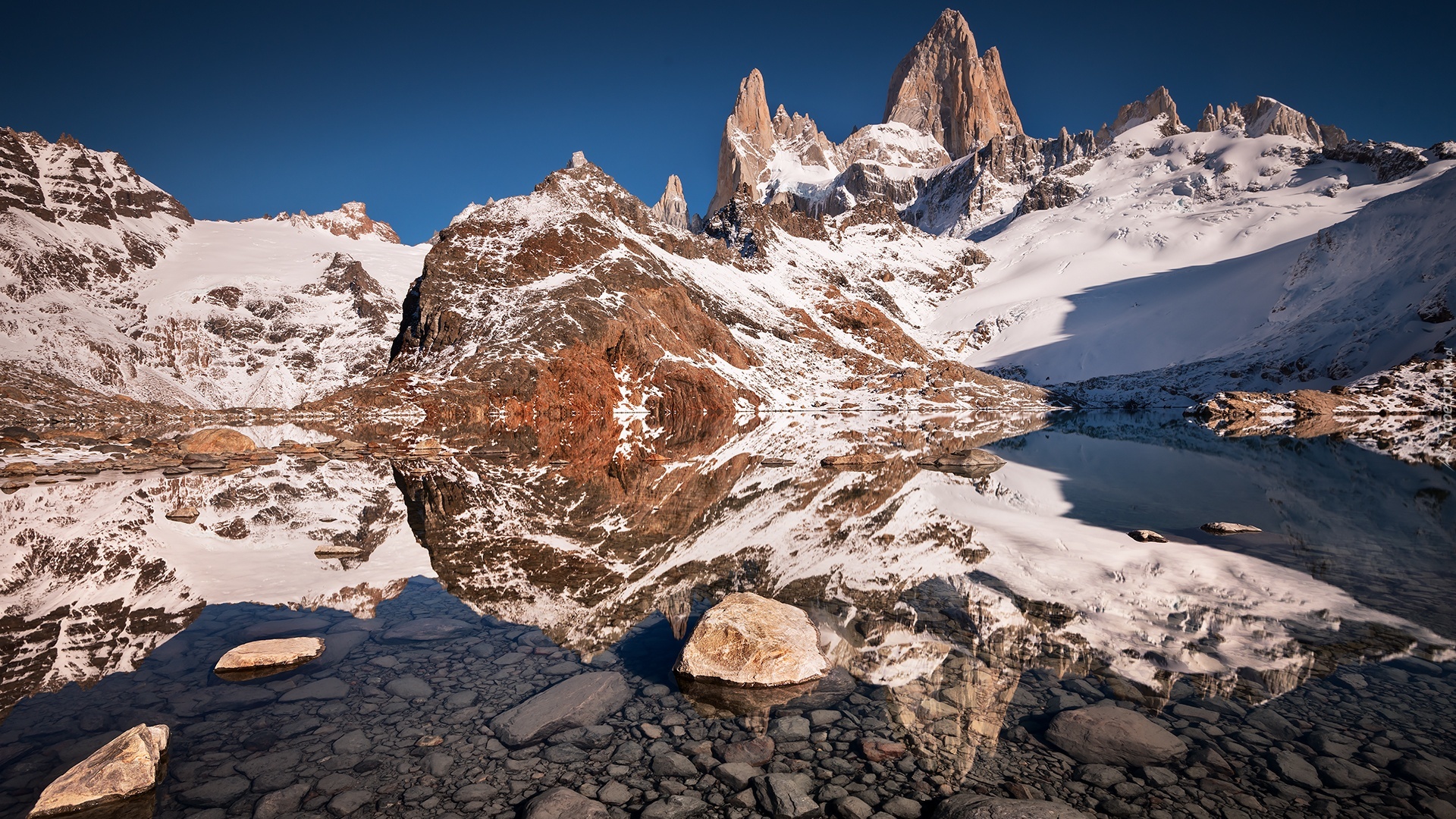 Edytor tapety: Niebo, Góry, Śnieg, Skały, Rzeka, Woda, Kamienie