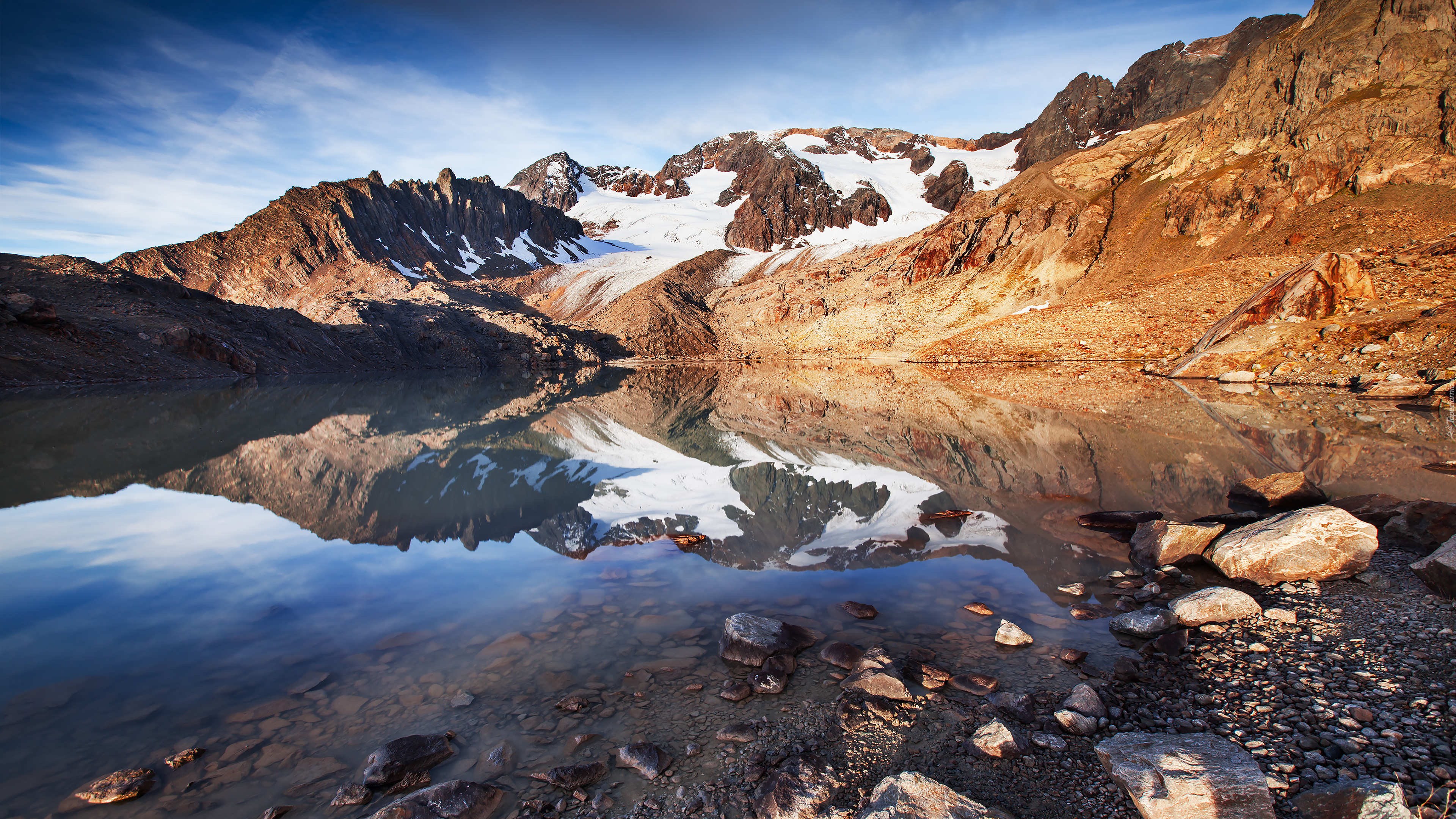 Edytor tapety: Niebo, Góry, Śnieg, Skały, Rzeka, Woda, Jezioro