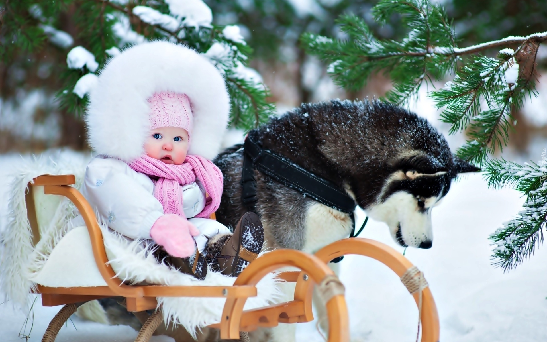 Edytor tapety: Dziecko, Sanki, Zima, Śnieg, Las, Siberian Husky