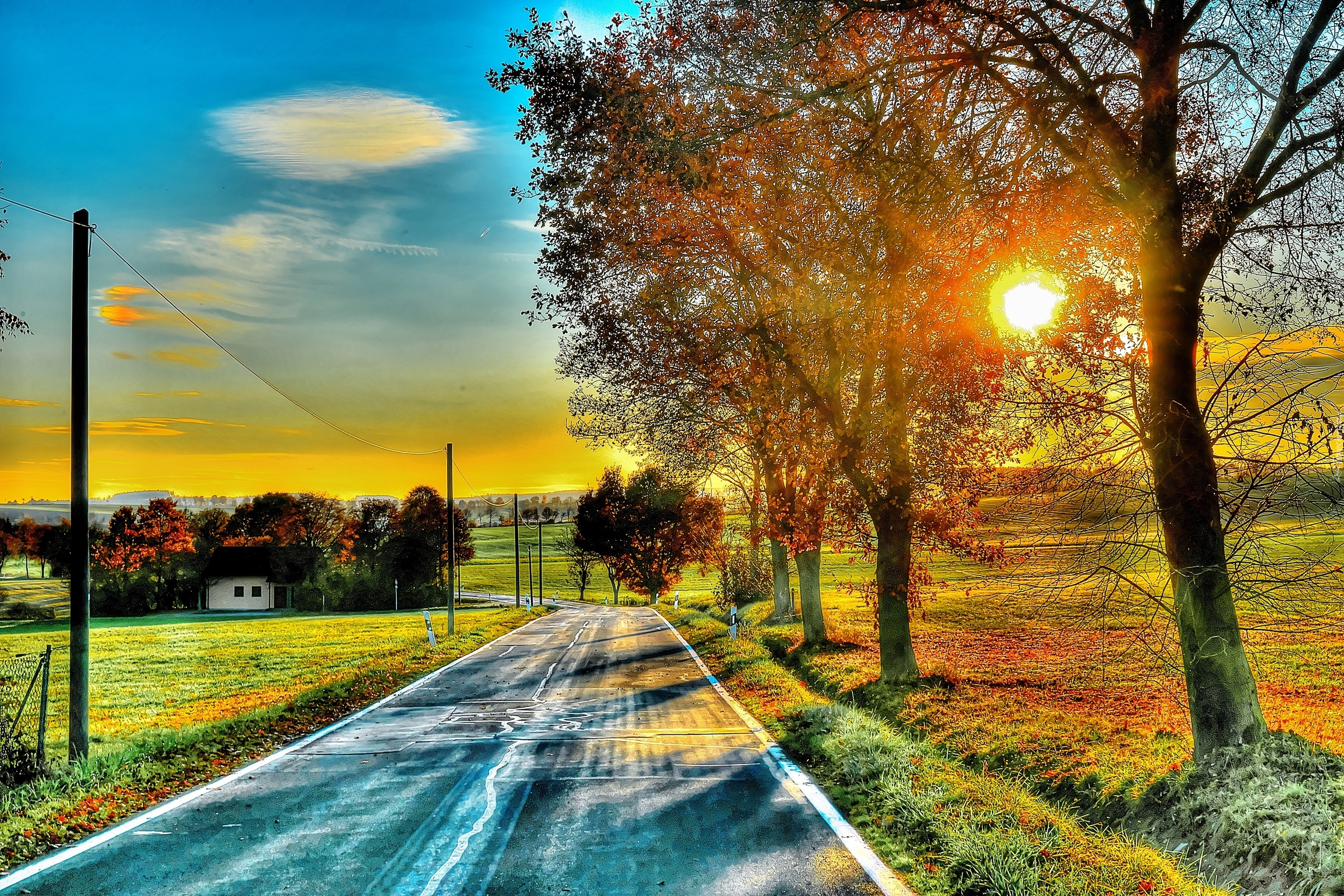Edytor tapety: Droga, Dom, Drzewa, Wschód Słońca