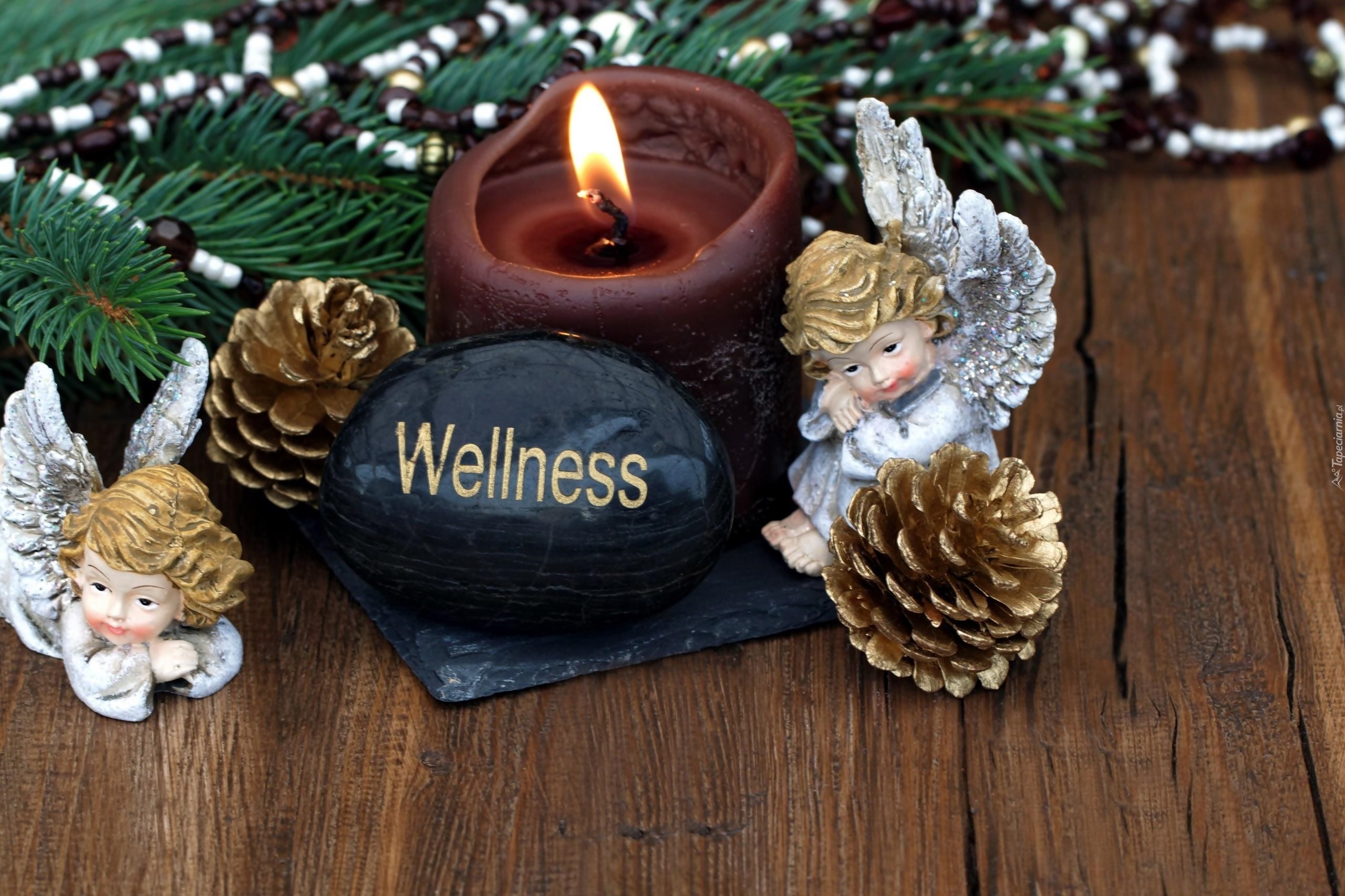 Edytor tapety: Świeca, Figurki, Aniołki, Szyszki, Gałązka, Świąteczna Kompozycja