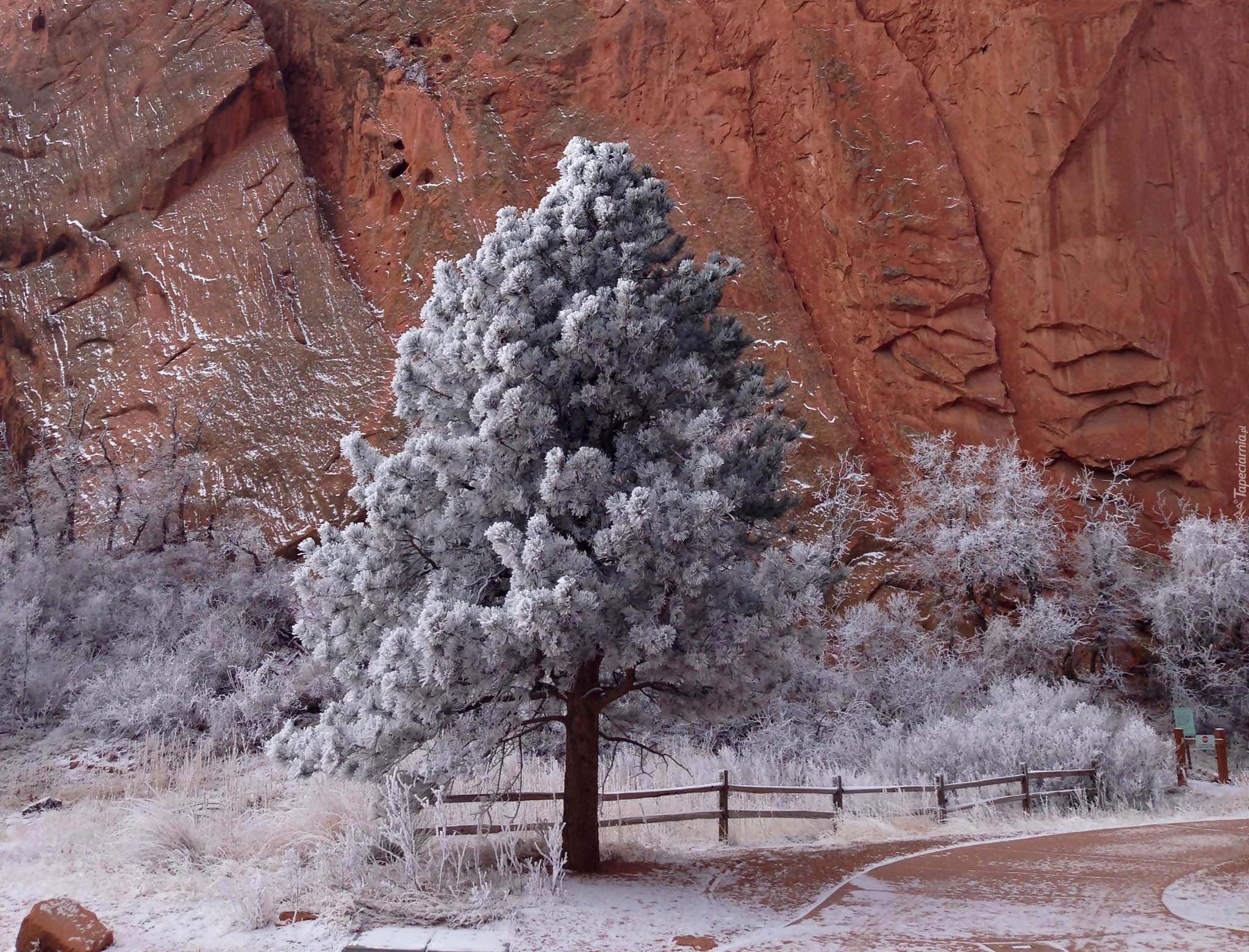 Edytor tapety: Góry, Skały, Droga, Zmrożone, Drzewa