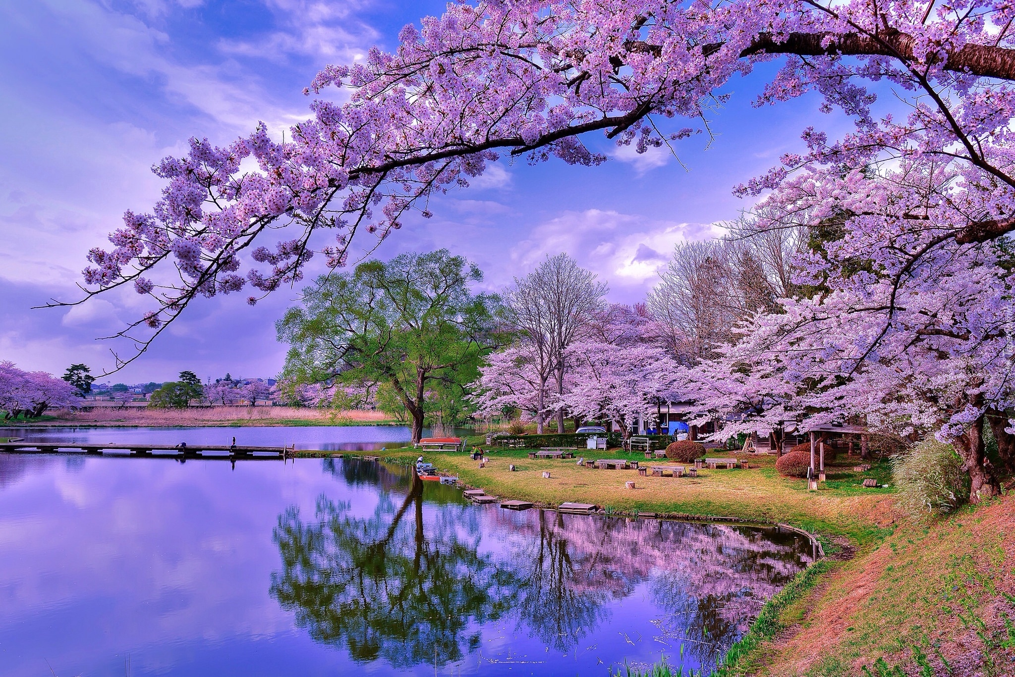Edytor tapety: Park, Rzeka, Drzewa, Wiśni, Odbicie, Wiosna