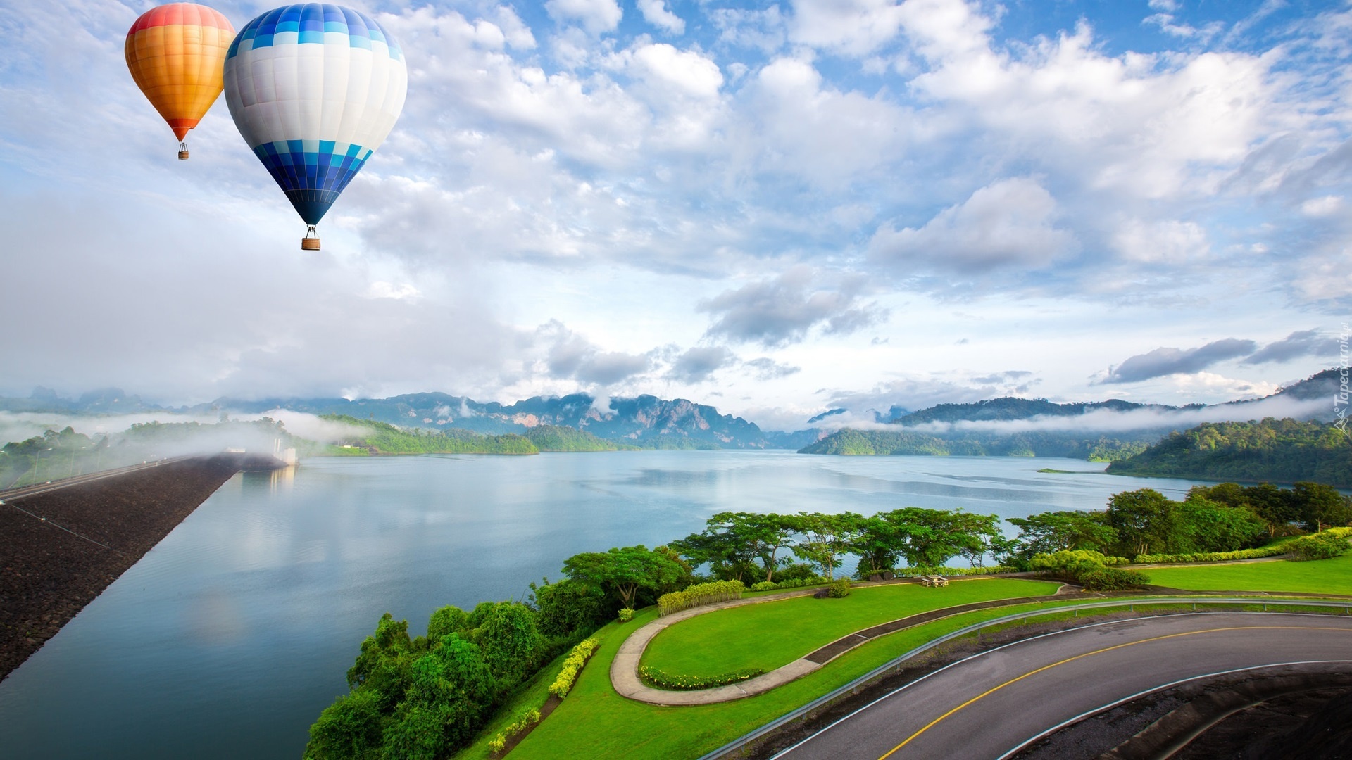 Edytor tapety: Jezioro, Droga, Góry, Balony