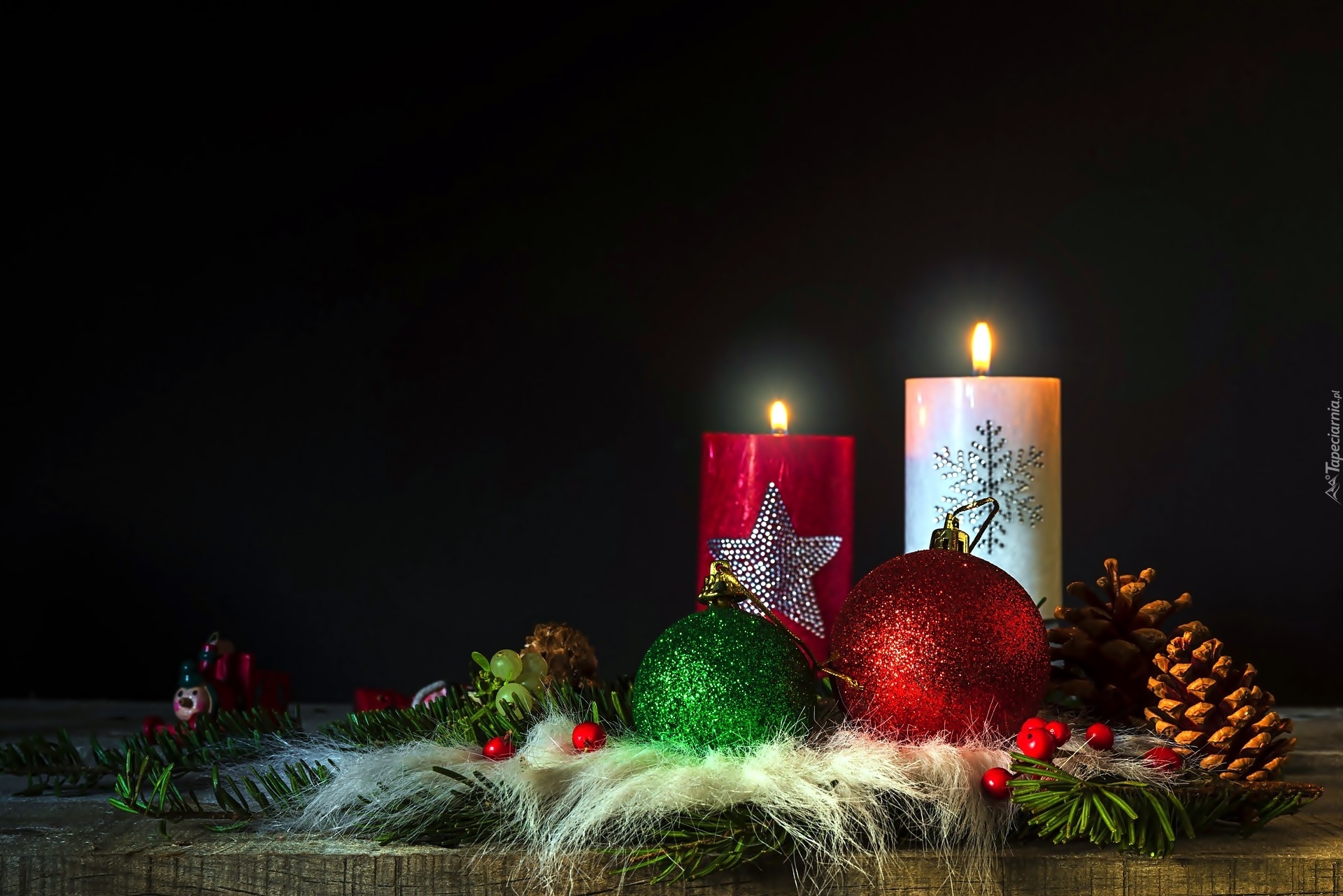 Edytor tapety: Świece, Bombki, Szyszki, Gałązka, Świąteczna, Dekoracja
