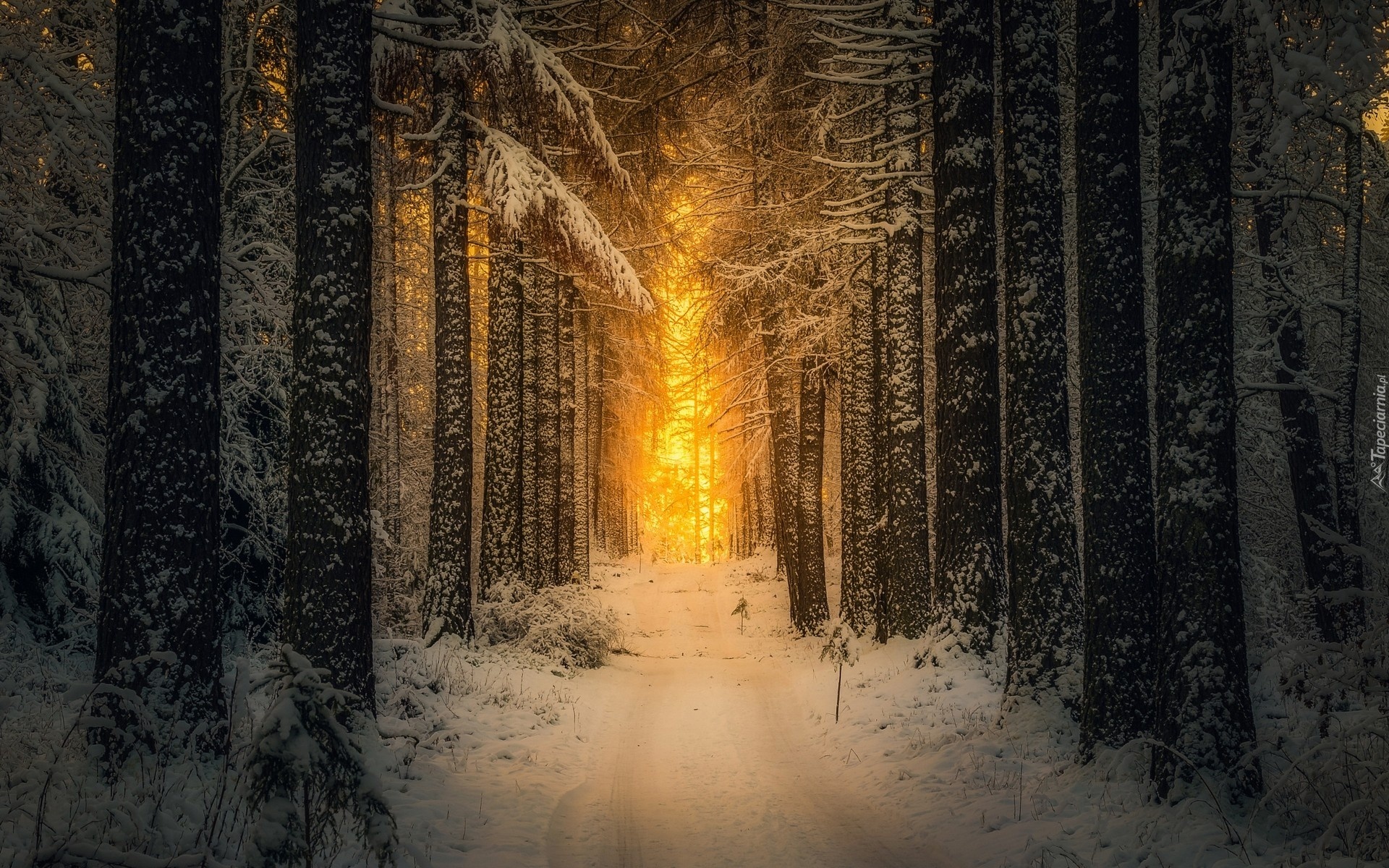 Edytor tapety: Zima, Droga, Promienie Słońca, Las