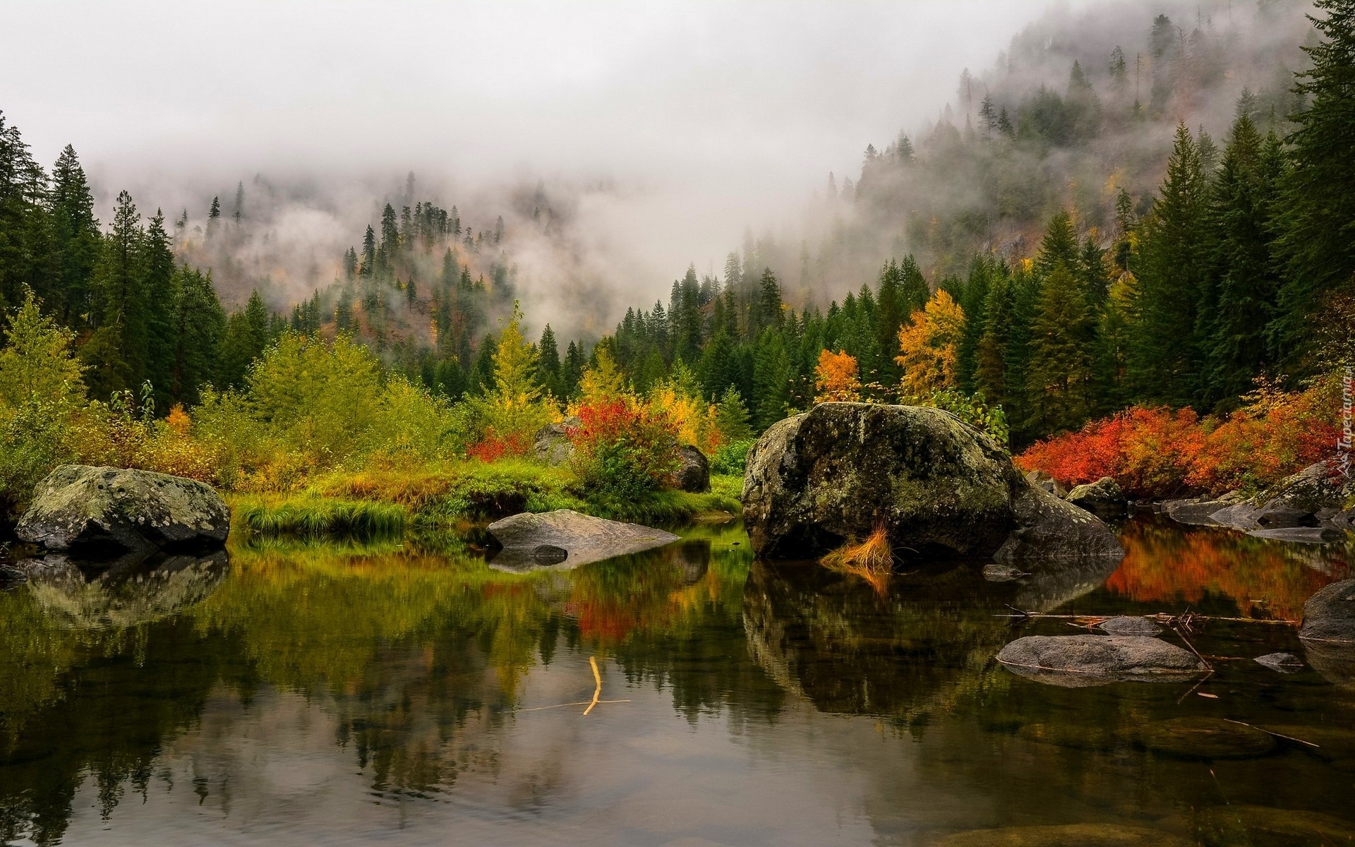 Edytor tapety: Jesień, Jezioro, Las, Mgła, Kamienie