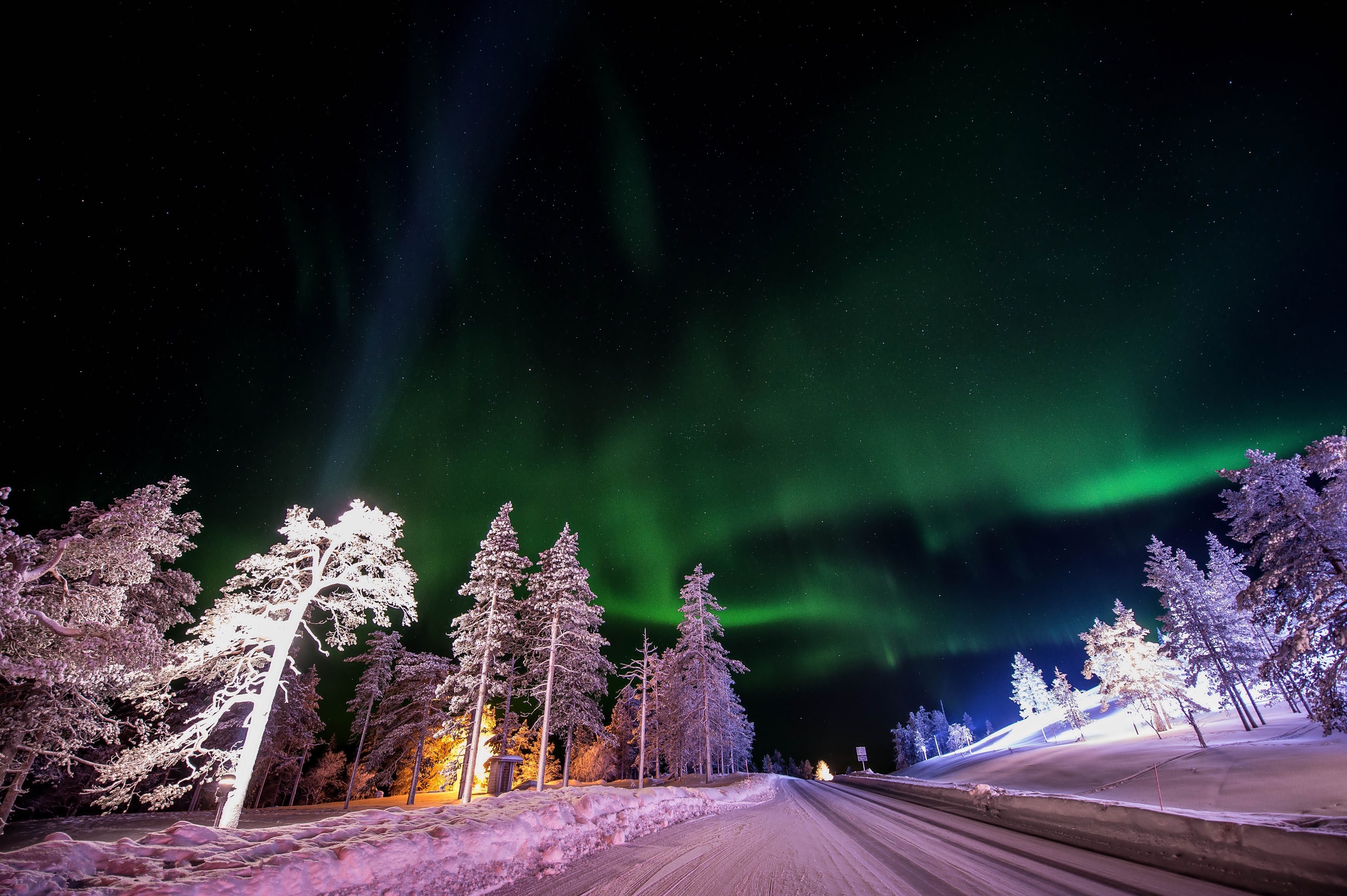 Edytor tapety: Zima, Droga, Drzewa, Zorza Polarna