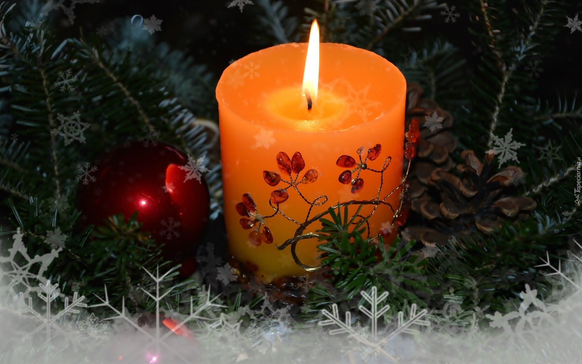 Edytor tapety: Świąteczna, Świeca, Gwiazdki, Śnieżynki, Bombka, Dekoracja
