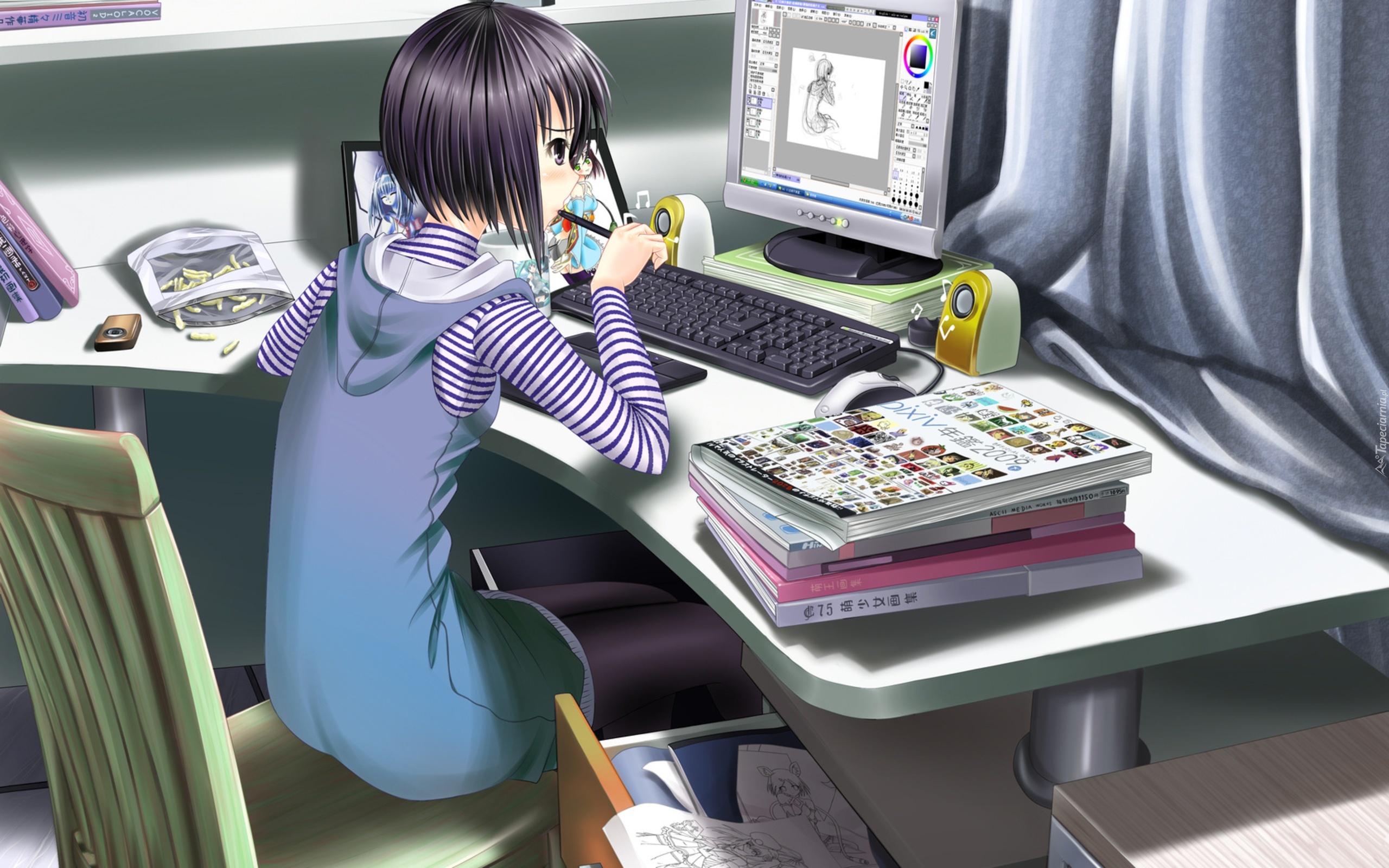 Edytor tapety: Dziewczyna, Krzesło, Biurko, Książki, Komputer, Manga, Anime