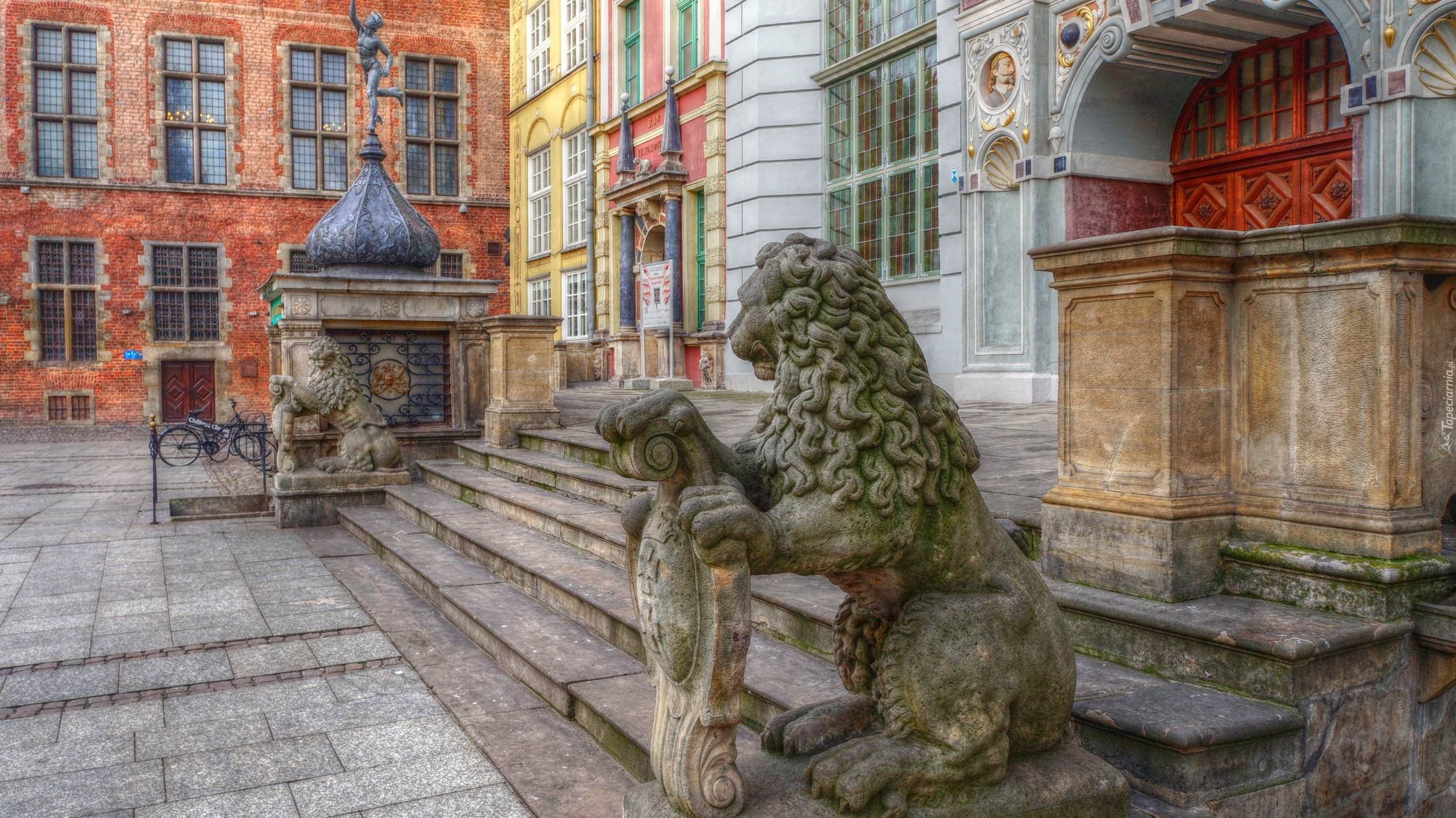 Edytor tapety: Gdańsk, Budynek, Dwór Artusa, Posągi, Kamienne, Lwy