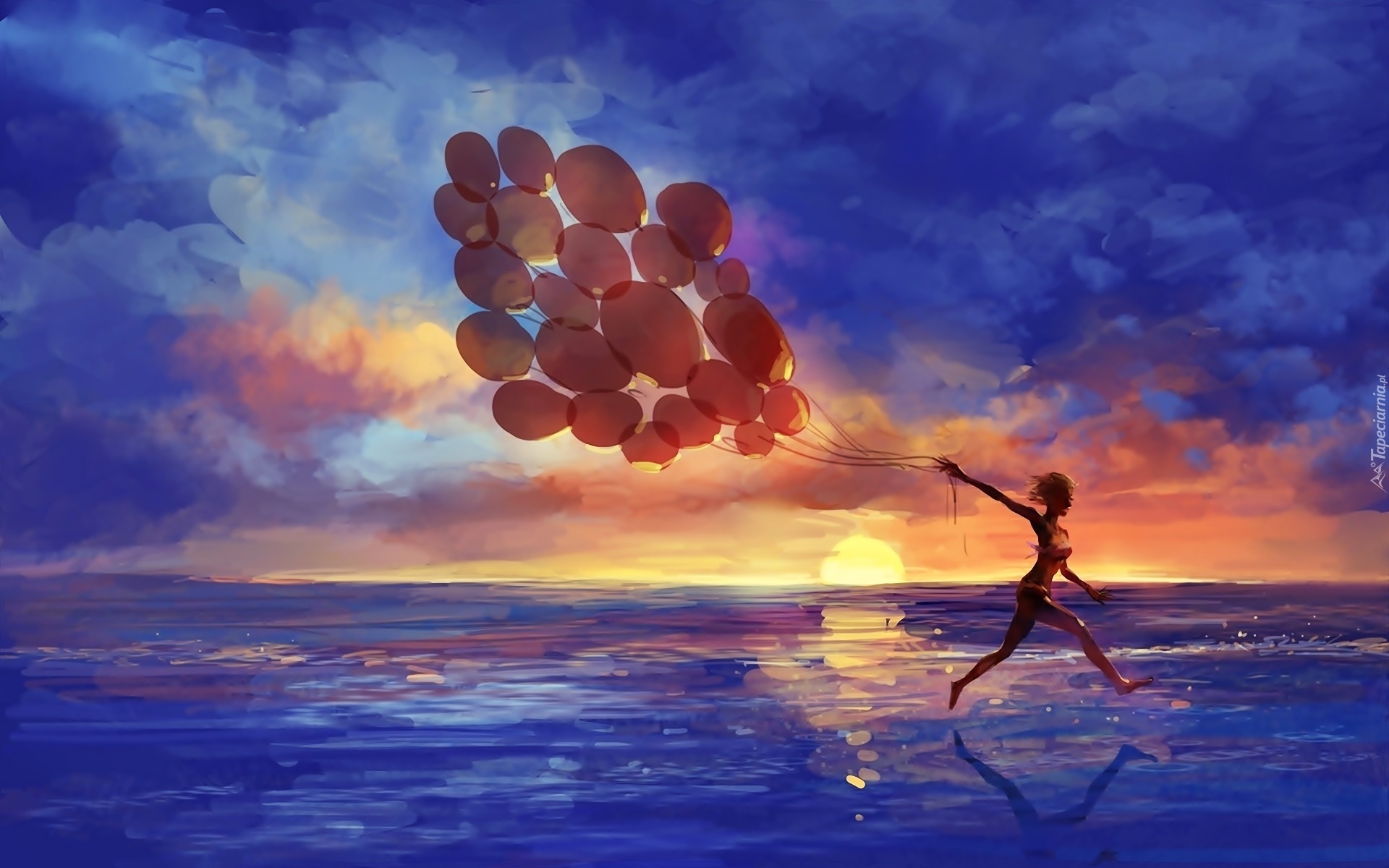 Edytor tapety: Morze, Zachód Słońca, Kobieta, Balony, Bieg