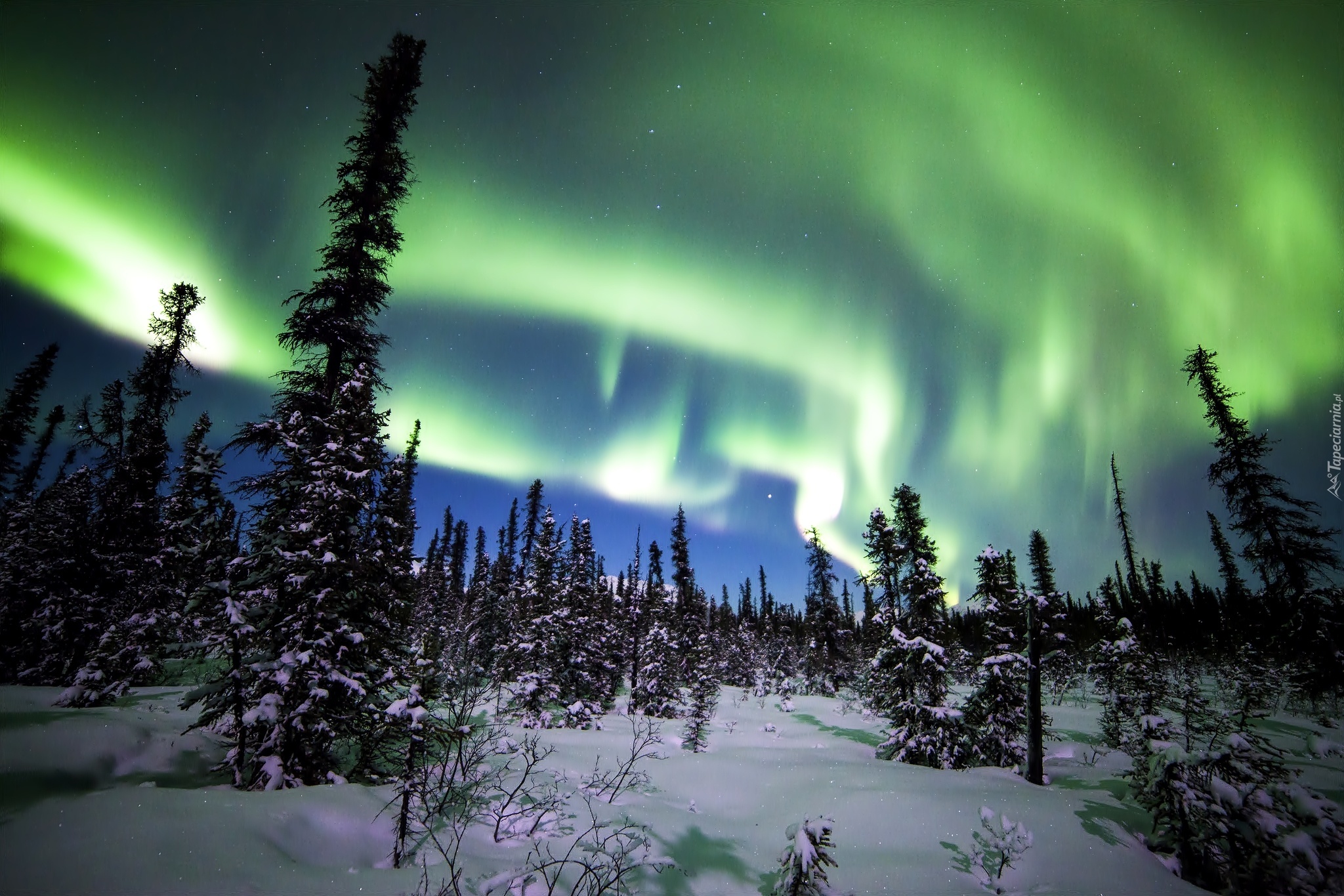 Edytor tapety: Zima, Zorza, Polarna, Ośnieżone, Świerki