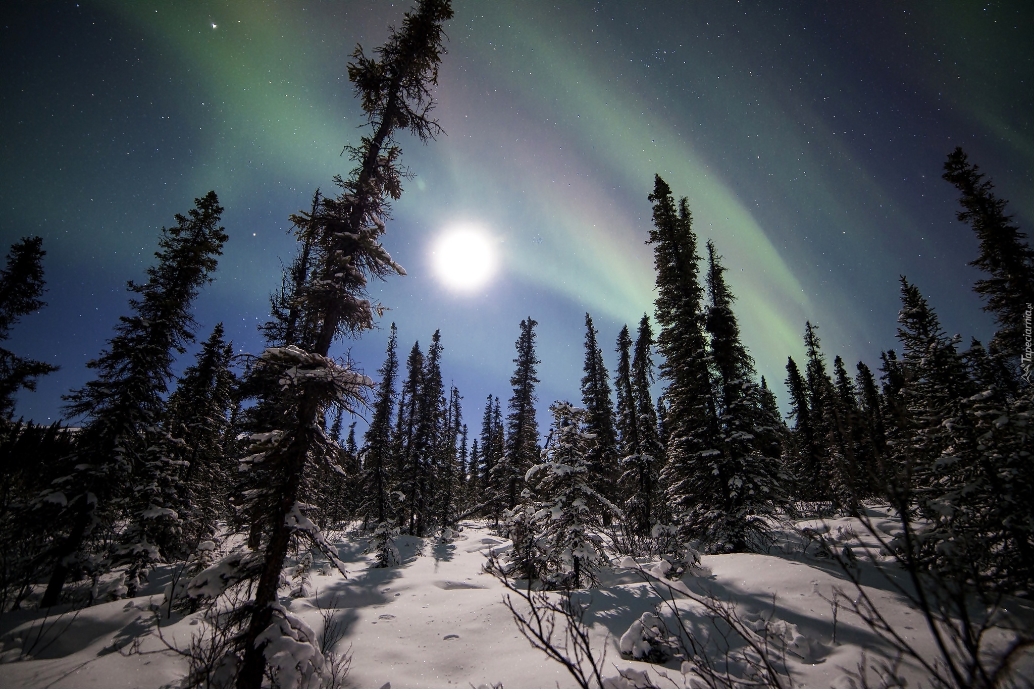 Edytor tapety: Zima, Wzgórza, Drzewa, Zorza, Polarna, Śnieg