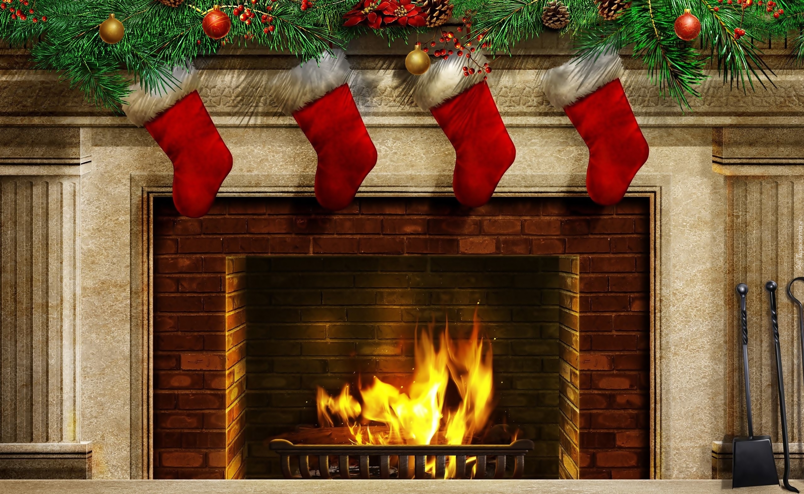 Edytor tapety: Kominek, Płomień, Skarpety, Świerk, Bombki, Szyszki