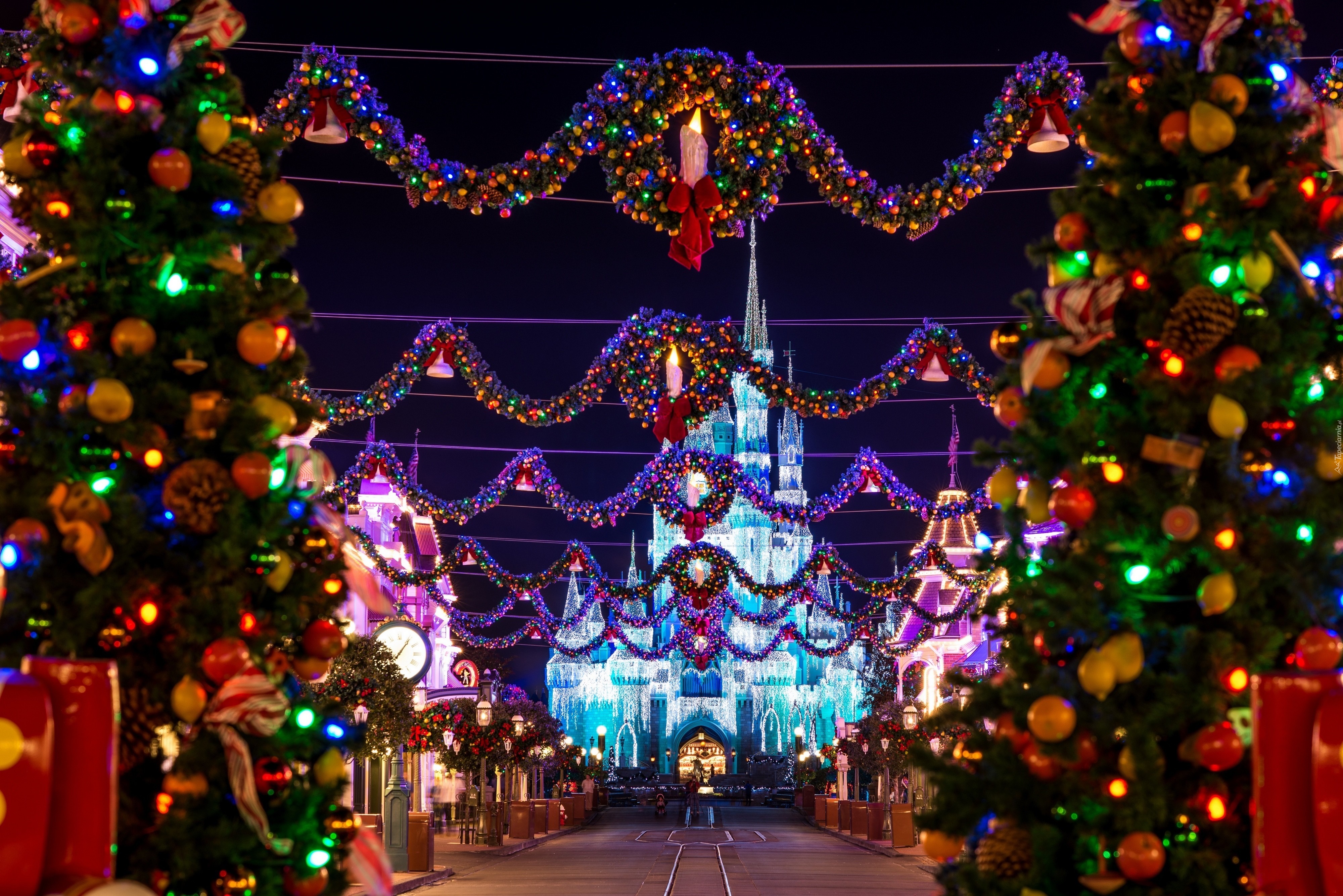 Edytor tapety: Disneyland, Zamek, Świąteczny Wystrój, Miasto Nocą