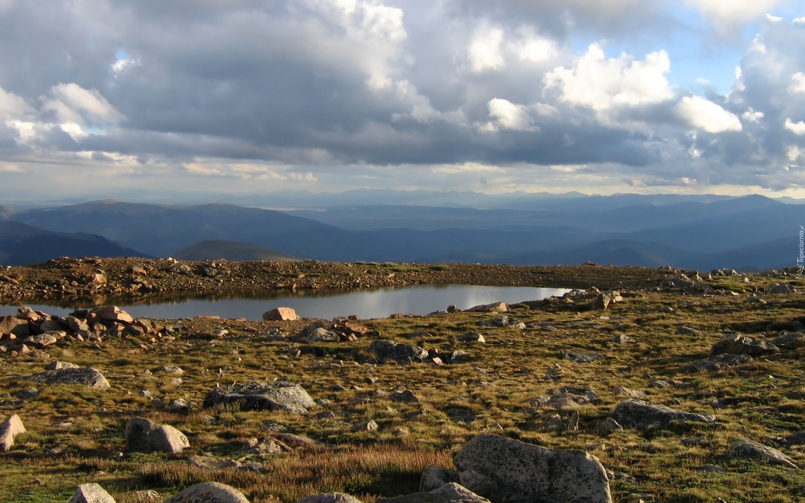 Edytor tapety: Góry, Chmury, Jezioro, Kamienie