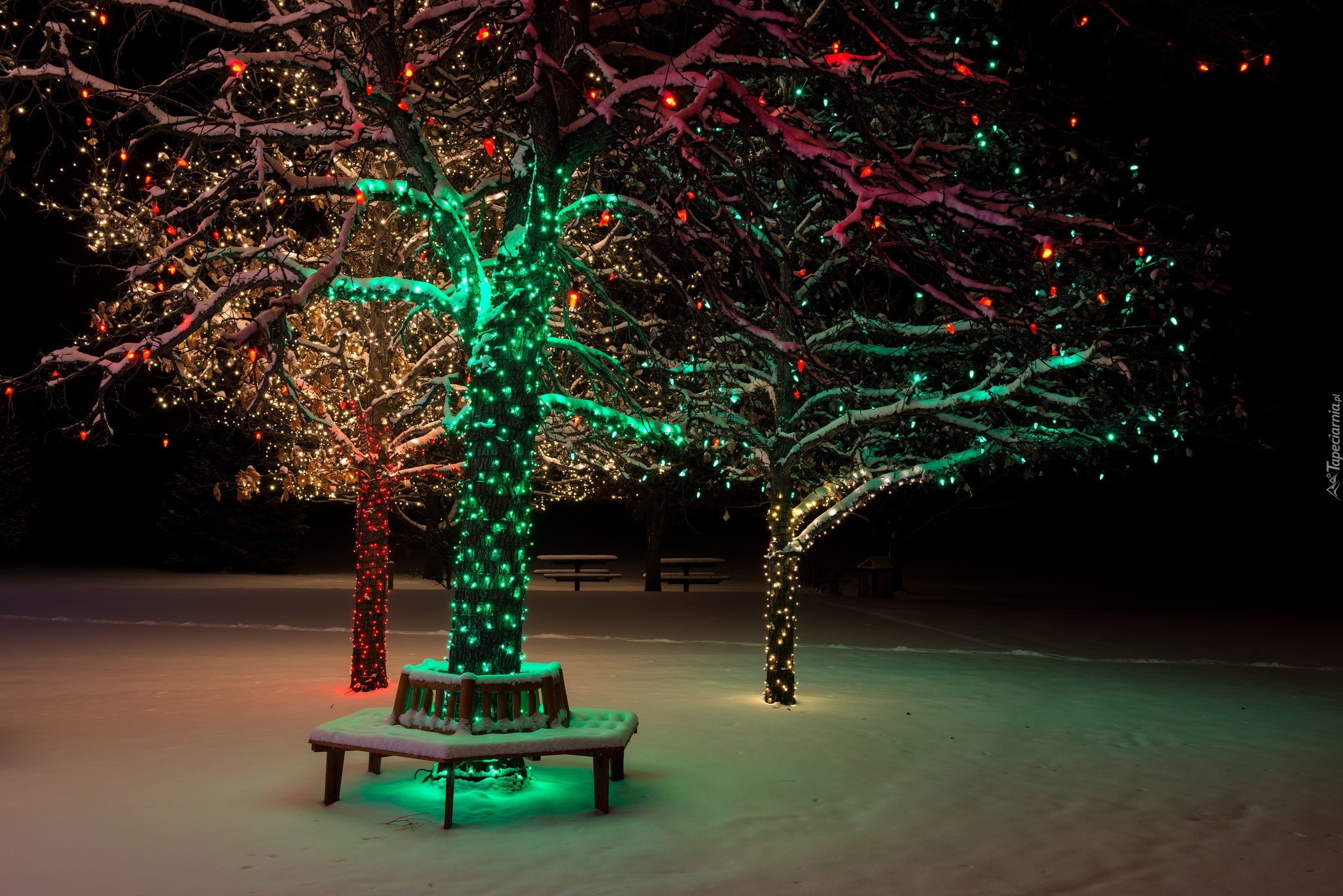 Edytor tapety: Oświetlone, Drzewa, Zima, Śnieg, Park