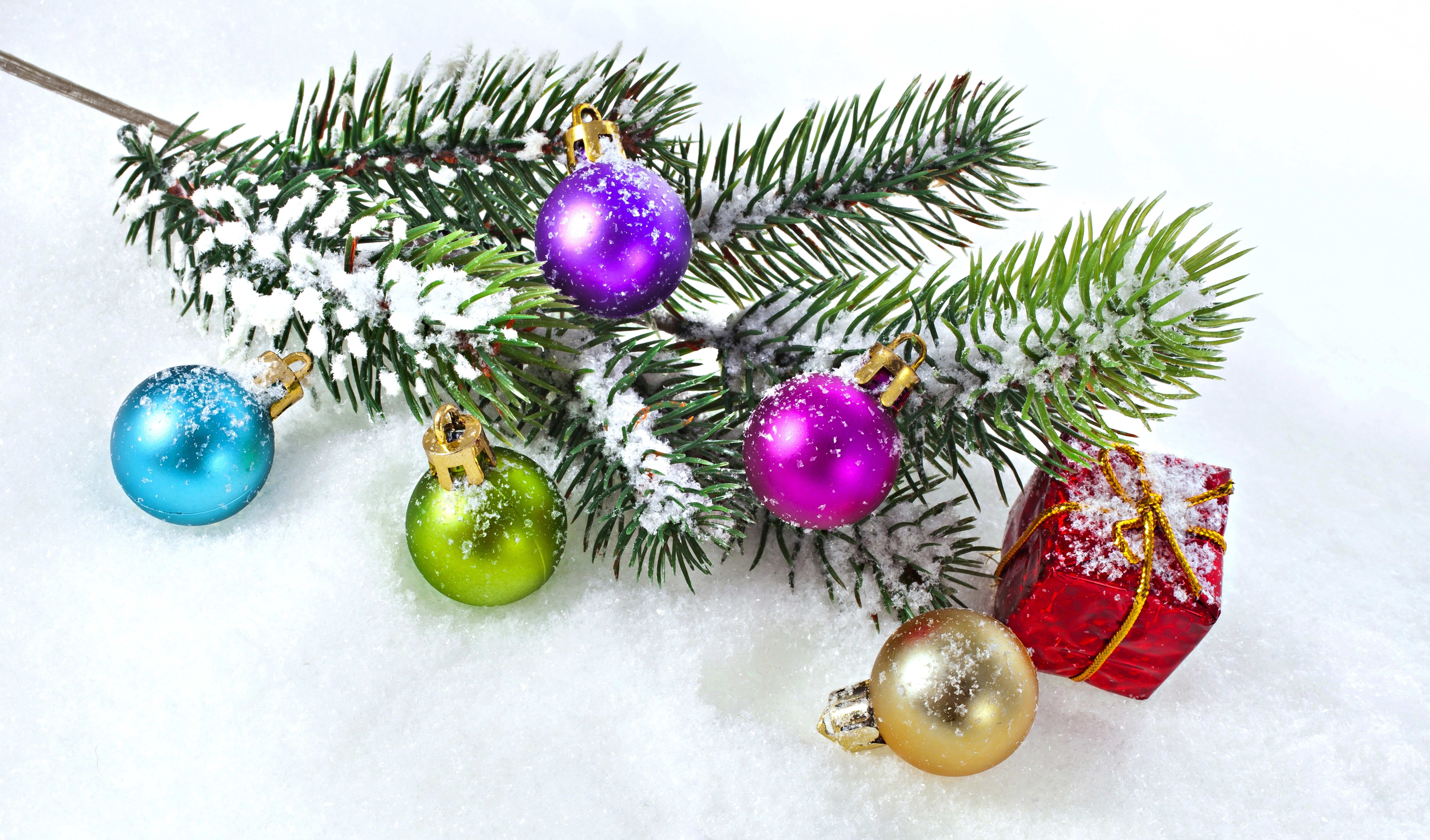 Edytor tapety: Świerkowa, Gałązka, Bombki, Śnieg, Święta