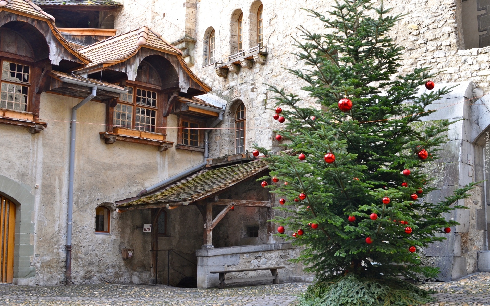 Edytor tapety: Zamek, Dziedziniec, Choinka