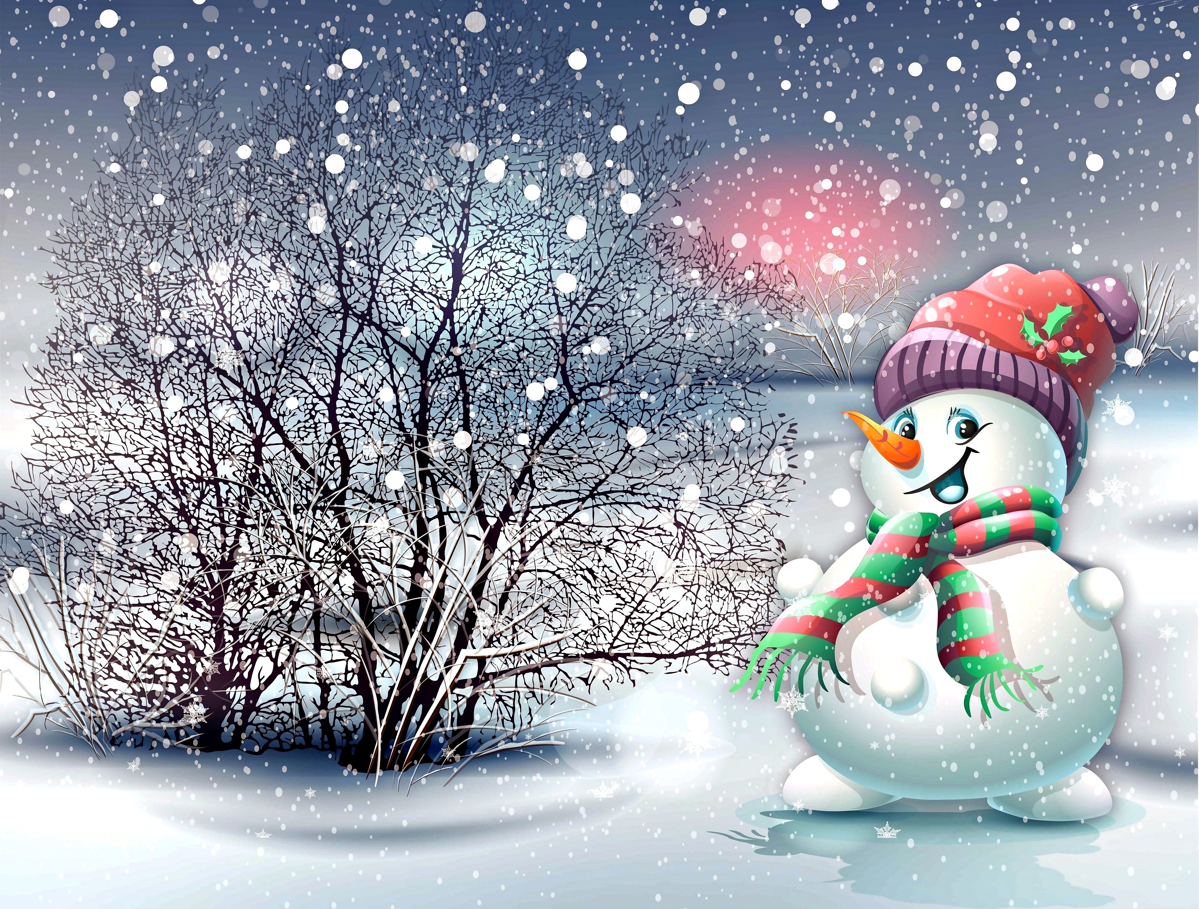 Edytor tapety: Zima, Drzewo, Bałwanek, Czapka, Szalik, Śnieg