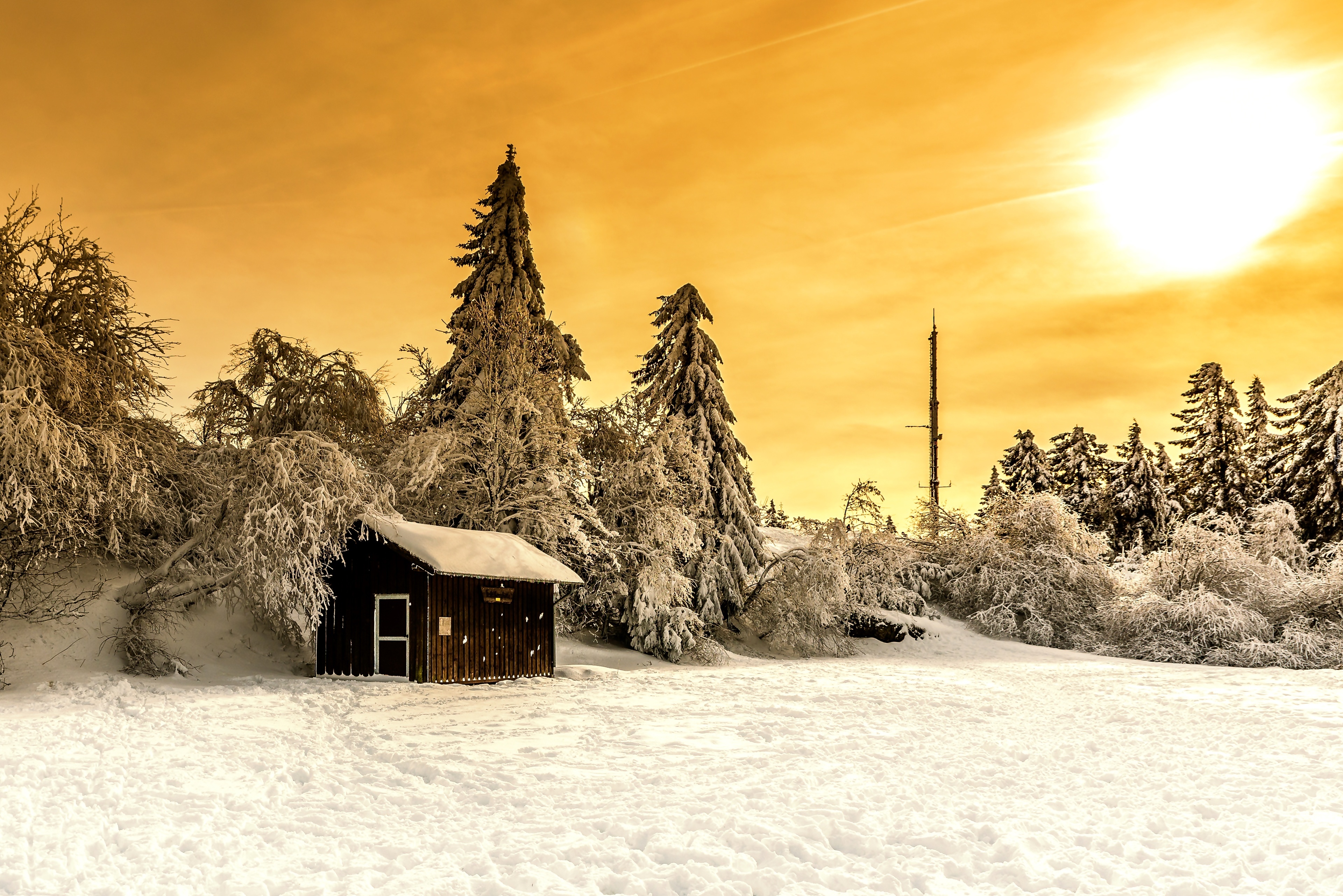 Edytor tapety: Zima, Ośnieżone, Świerki, Szopa