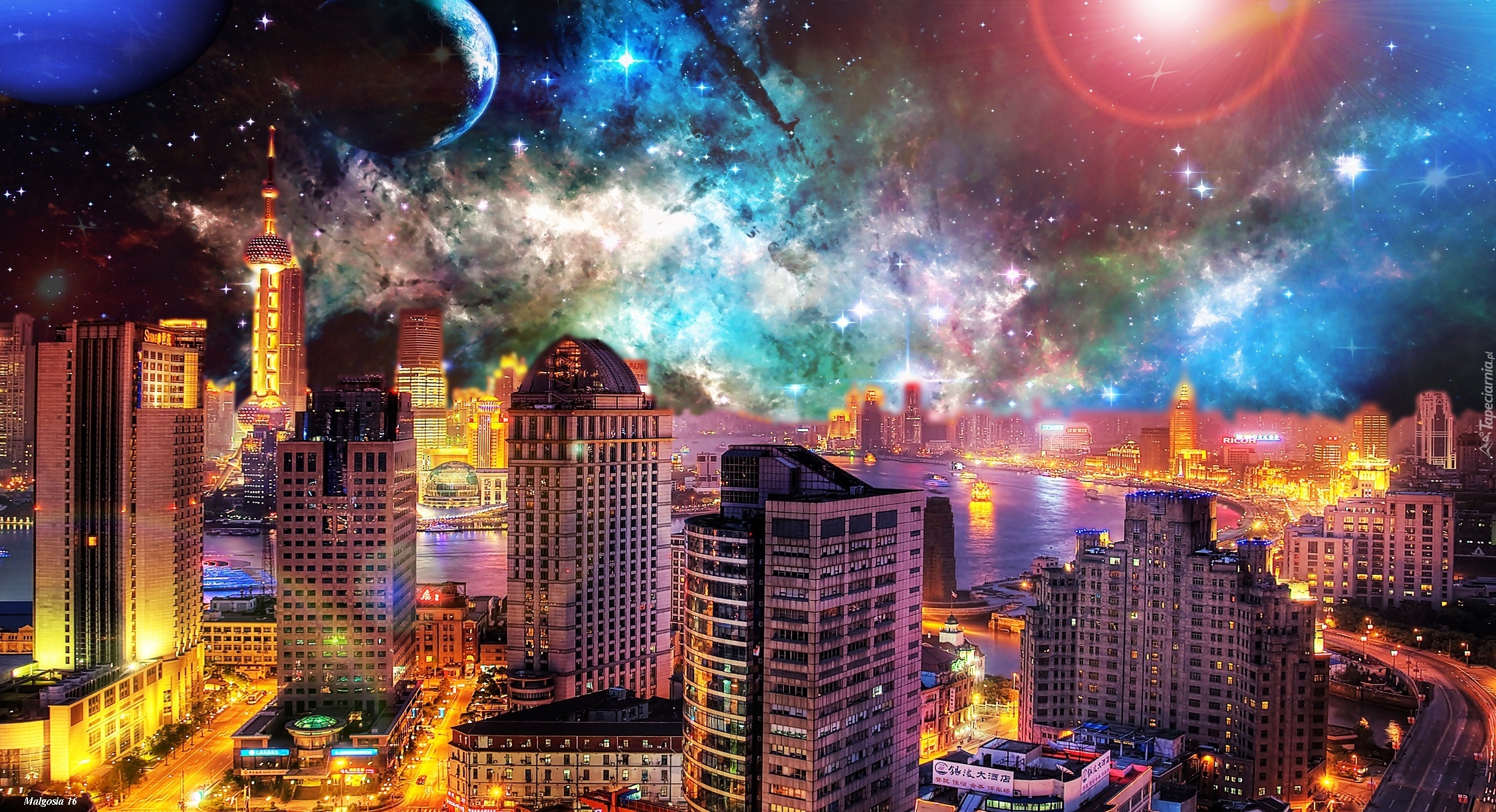 Edytor tapety: Miasto, Wieżowce, Noc, Galaktyka, Niebo, Gwiazdy