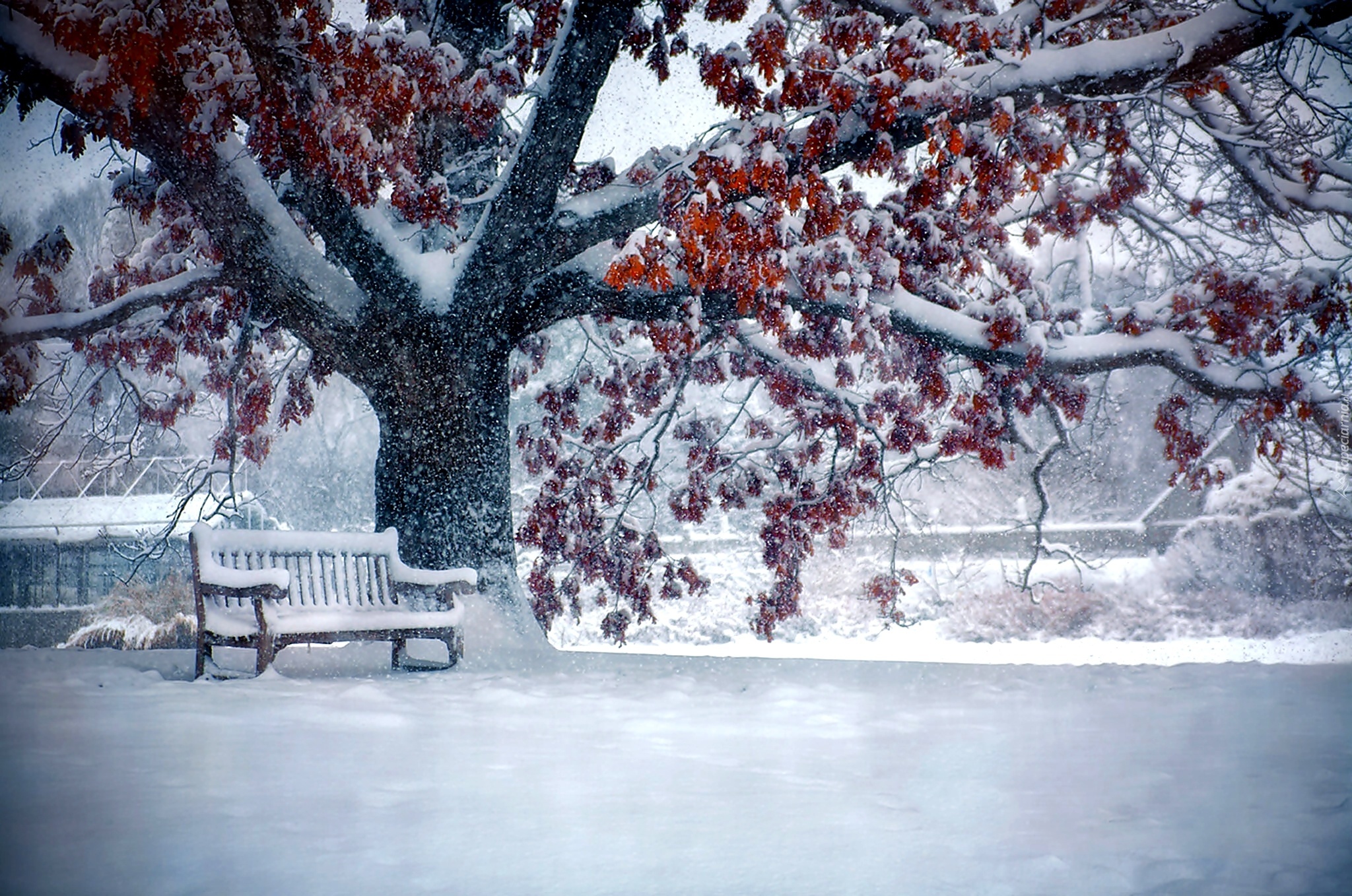 Edytor tapety: Zima, Ośnieżone, Drzewo, Ławka, Park