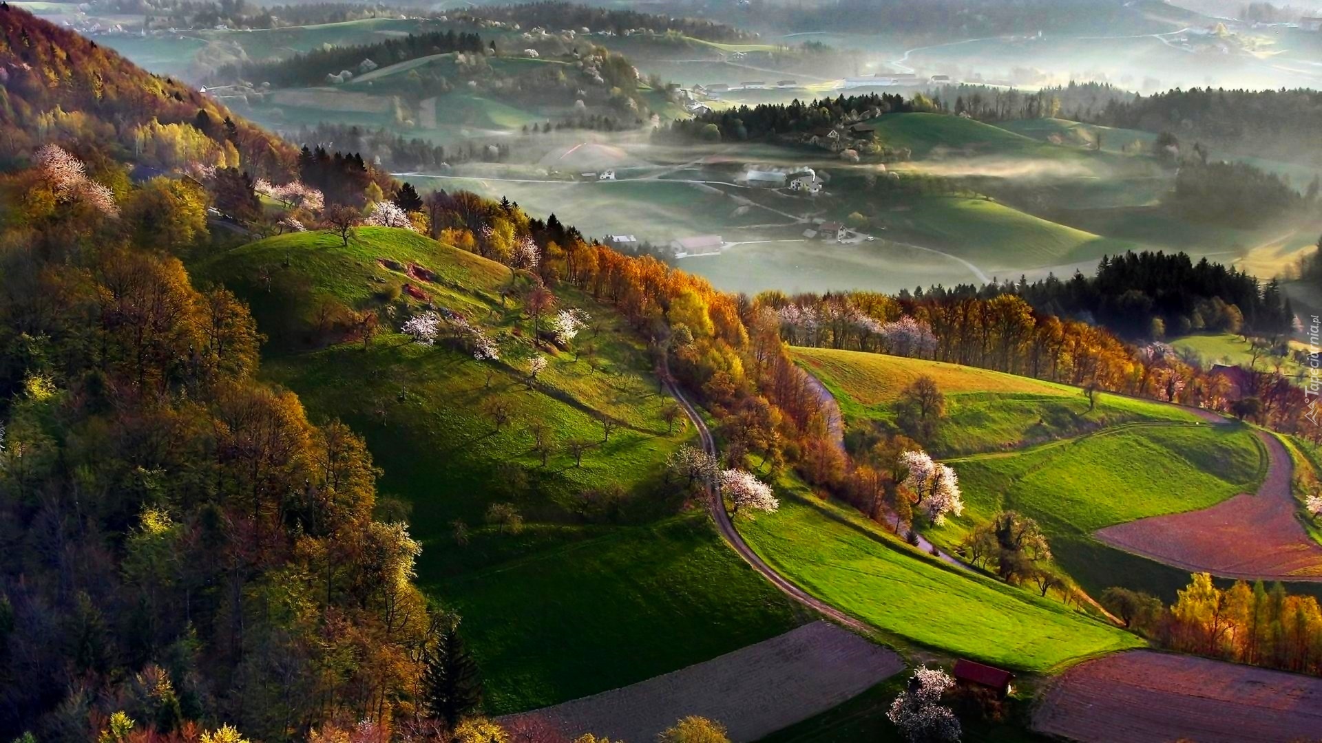 Edytor tapety: Góry, Pagórki, Jesień, Droga, Las, Domy, Mgła