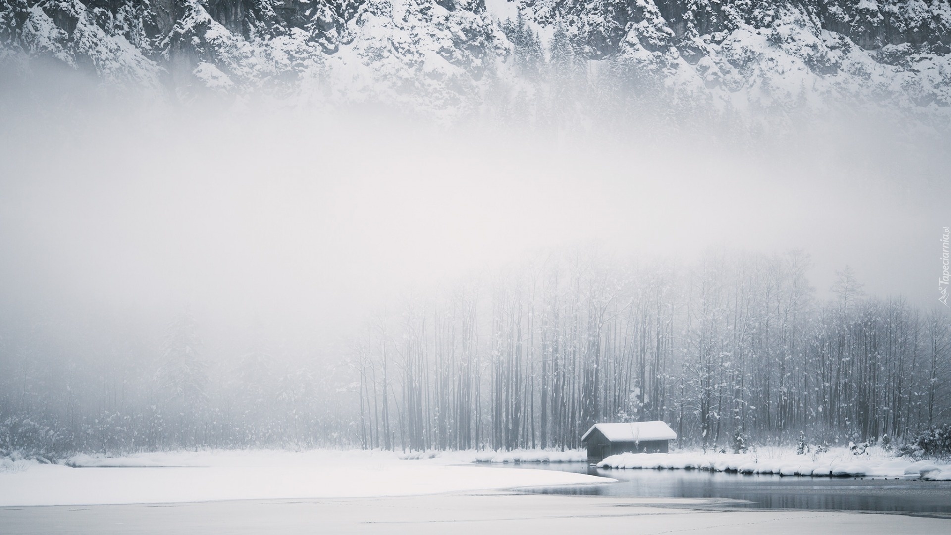 Edytor tapety: Zima, Śnieg, Mgła, Las, Jezioro