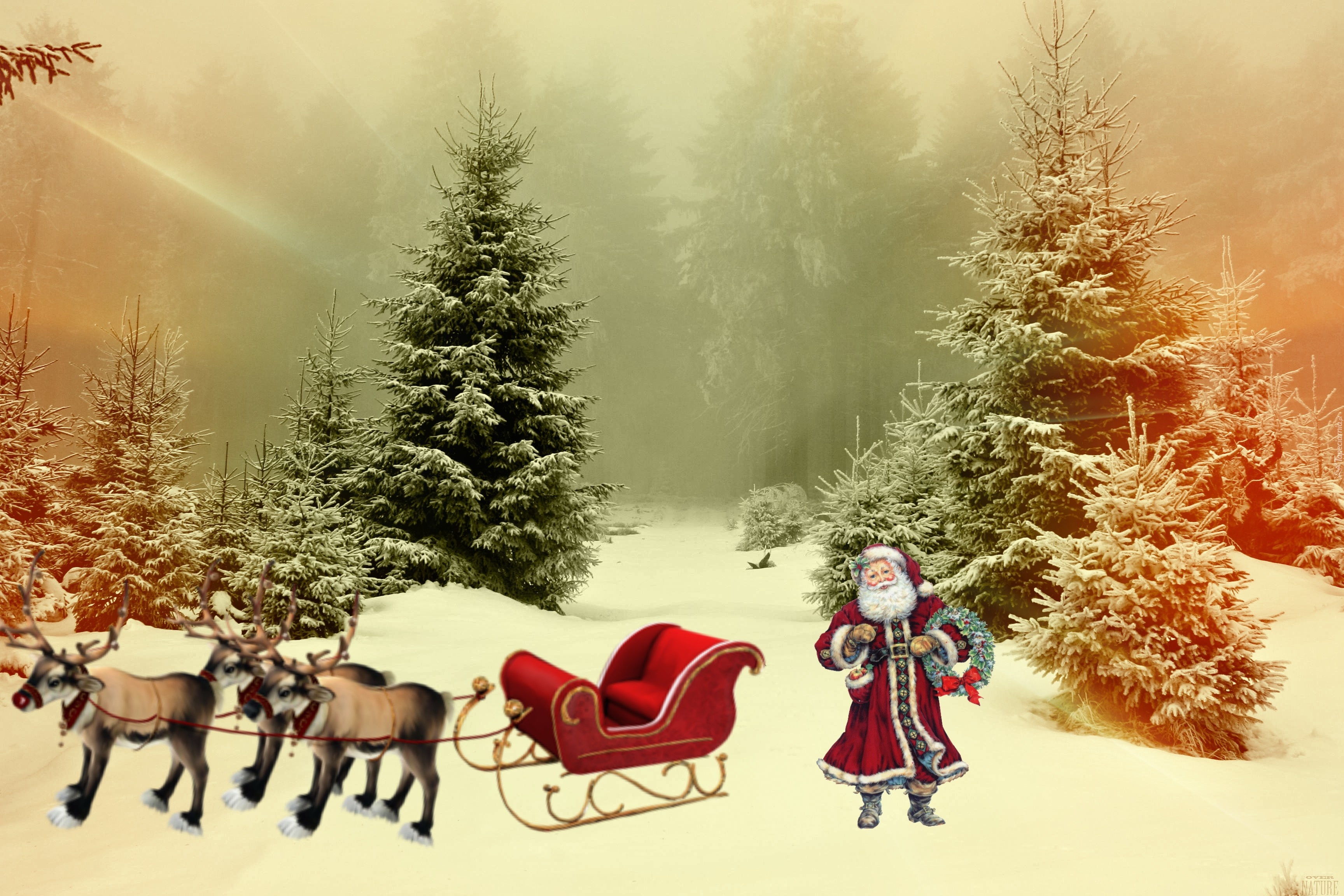Edytor tapety: Śnieg, Las, Sanie, Renifery, Mikołaj