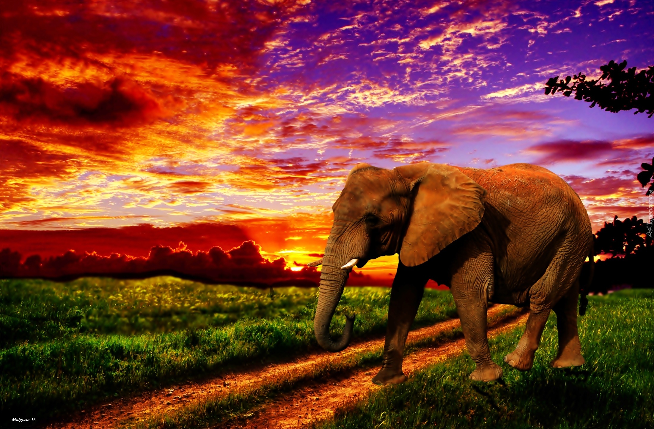 Edytor tapety: Zachód Słońca, Słoń, Droga