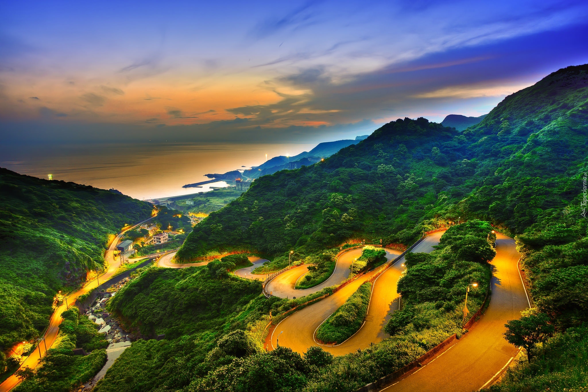Edytor tapety: Góry, Las, Zachód, Słońca, Droga